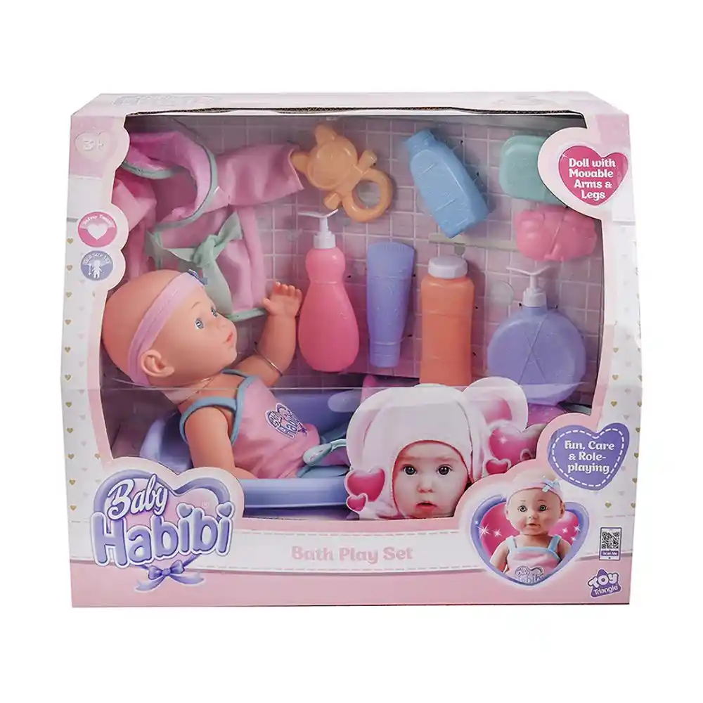 Make bath time fun with the Baby Habibi 14-inch Doll with Bath Play Set! This adorable doll features realistic details and a soft, huggable body, perfect for little hands.The set includes a bath play set for interactive and imaginative play, encouraging nurturing skills and endless creative fun. Made from high-quality, child-safe materials, this Baby Habibi doll is ideal for children aged 3 and up.