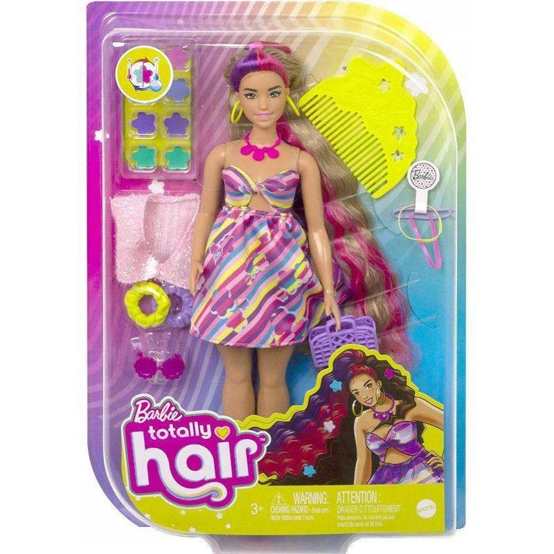 Inspired by the best-selling Barbie doll that first made waves 30 years ago, the Barbie Totally Hair flower-themed doll rocks her hairstyle, hair texture, and fashion look! The doll has 8.5 inches of extra-long playable hair and comes with 15+ additional pieces including 8 color change hair clips, styling accessories, and an extra fashion. Barbie doll has a curvy body shape and comes with bright pink and purple color block streaks in her wavy hair that also has a ponytail on top. She wears a vibrant daisy-printed dress with a cut-out detail. Kids will love creating different hairstyles and the endless styling possibilities! Doll cannot stand alone.