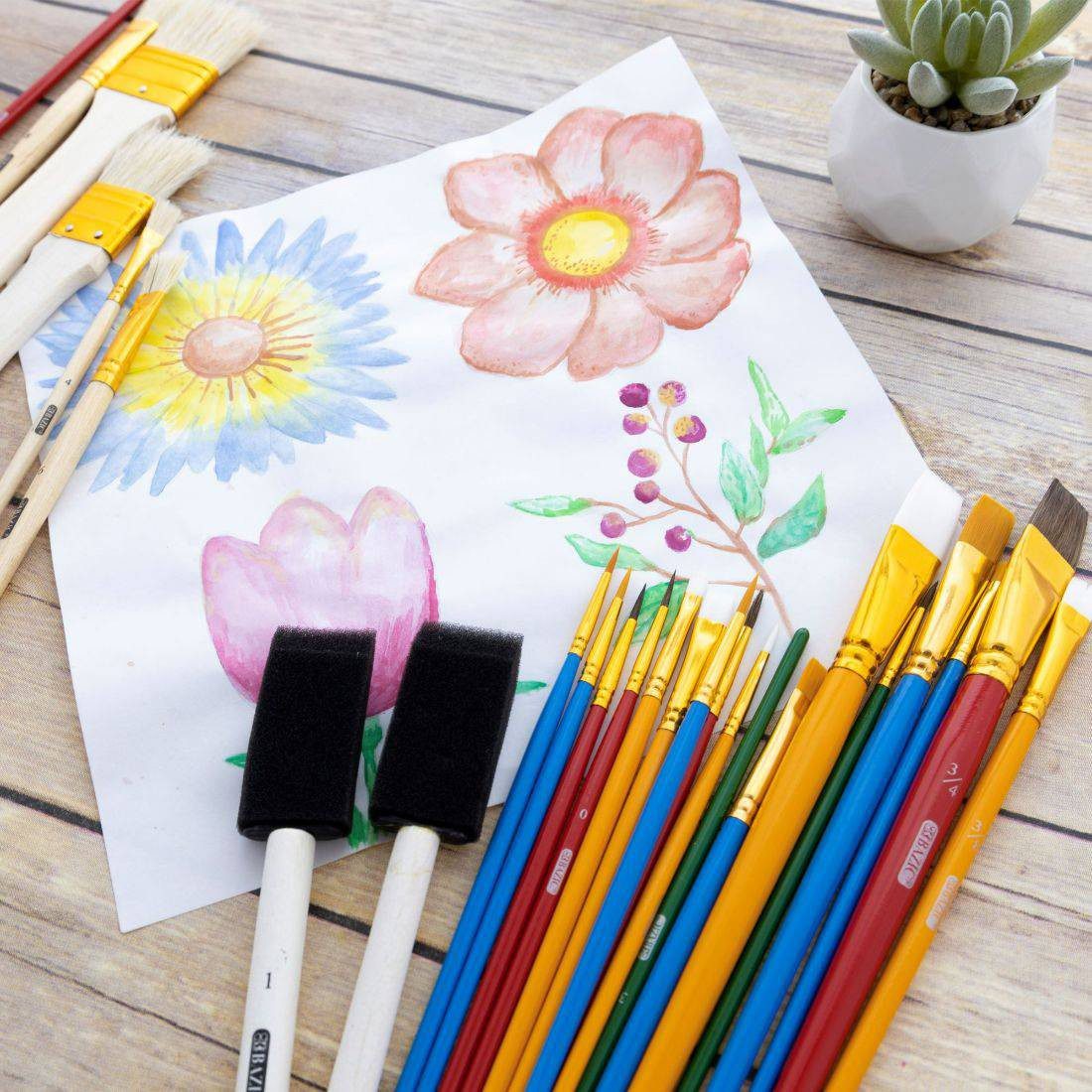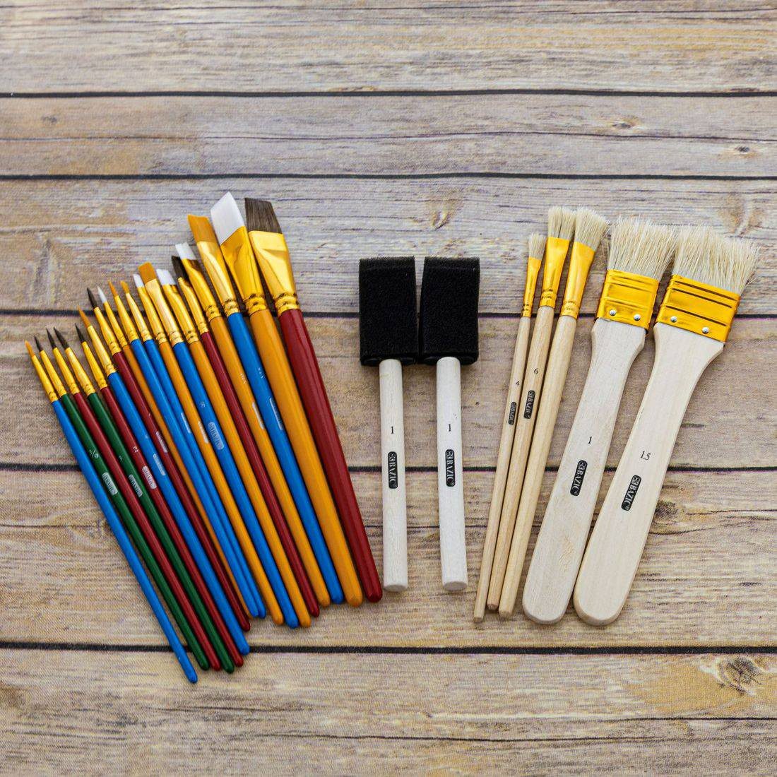 ASSORTED SIZES. Include round and flat natural hair, bristle hair, foam, and nylon paint brushes in assorted sizes: 7 Natural Hair, 5 Bristle Hair, 11 Nylon, and 2 Foam brushes.EMBRACE YOUR CREATIVITY. Brushes on a sturdy wood handle. Keep the paint flowing and your childs creativity growing.