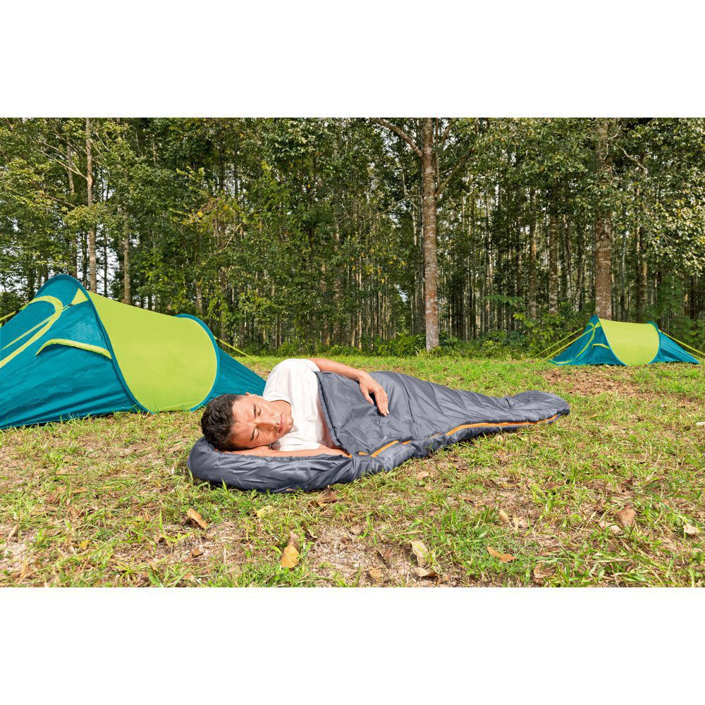 The Bestway Mummy sleeping bag Hiberhide 5 – your reliable companion for ultimate sleeping comfort outdoors! With a size of 230 x 80 x 60 cm, the Hiberhide 5 offers enough space to stretch out and relax. Suitable for a temperature range of 3 – 8 °C, this sleeping bag will keep you warm even on cooler nights. Made from high-quality 210T polyester and equipped with hollow fibre insulation, this sleeping bag offers reliable insulation and durability. The mummy graphic with semi-circular head section provides extra warmth and comfort, while the insulating protection along the zip and the protective shoulder panel protect you from draughts and cold. The Bestway mummy sleeping bag Hiberhide 5 comes with a practical compression sack that allows you to stow and transport it compactly.