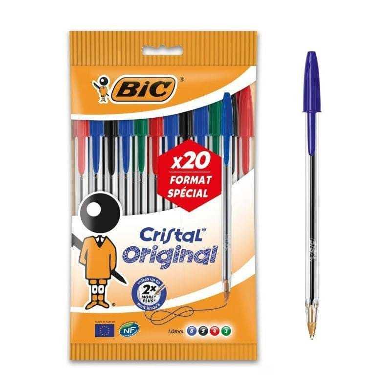 The best-selling emblematic pen in the world, the BIC Cristal Original is available here in 4 colors: blue x8, black x5, red x4 and green x3, Its 1.0mm medium tip glides over paper with unrivaled comfort and delivers clean, crisp writing, Its transparent body reveals the level of ink: functional, refined, recognized design; nothing superfluous, Awarded for its lightness and average writing length (3 km), the Cristal Original ballpoint pen is NF Environnement certified.It is entirely made in France in BIC factories, with unique know-how passed down for decades.