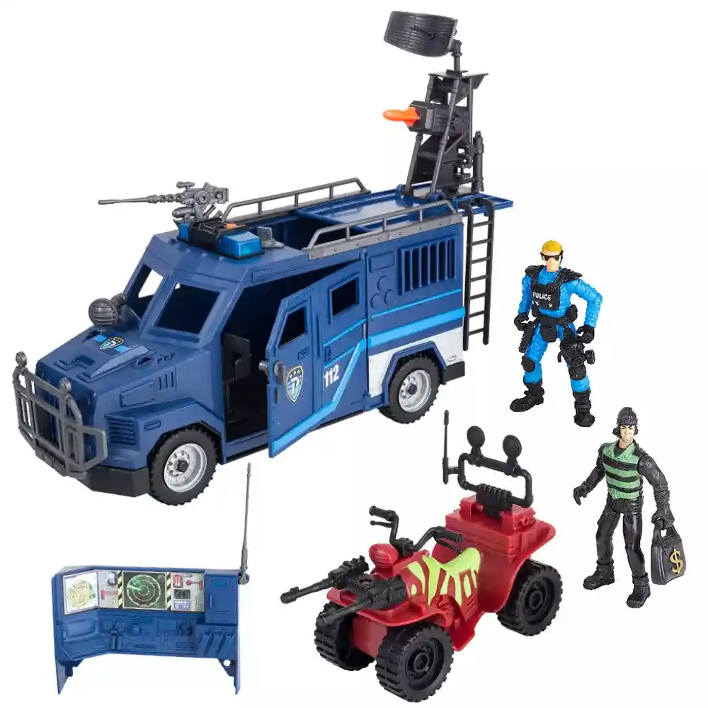 The S.W.A.T. truck features push-button light and sound effects, such as a siren and a rapid-fire rifle sound that plays as lights flash, enhancing the immersive play experience.