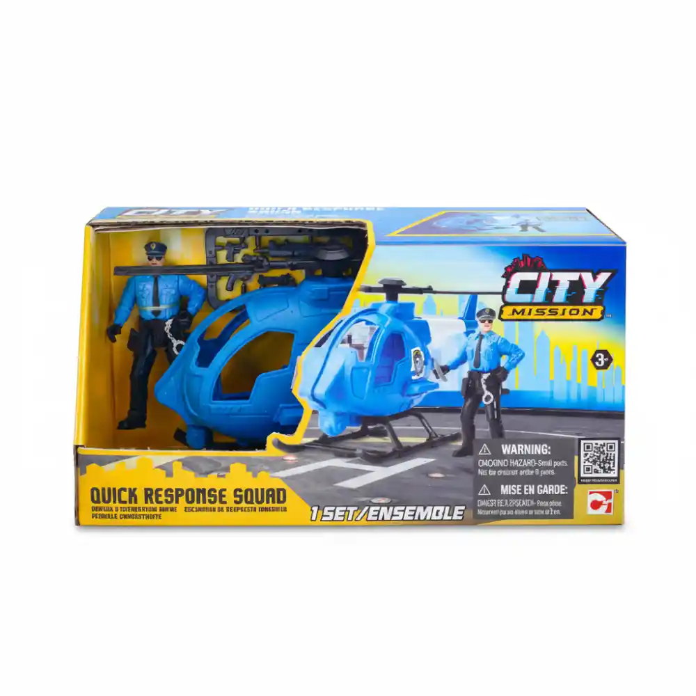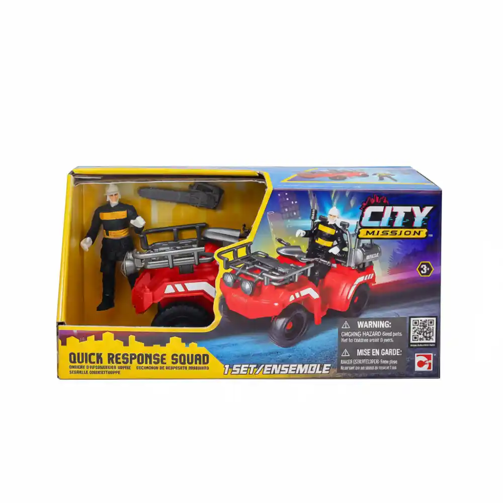 hether they need to pull off a dangerous fire rescue by ground, or chase down lawbreakers by air, the brave heroes of the City Mission Quick Response Squad are on the case! The firefighter fits inside the free-wheeling flame breaker ATV buggy, which has an array of firefighting tools attached, including fire hoses and chainsaws! The police officer fits inside the police chopper