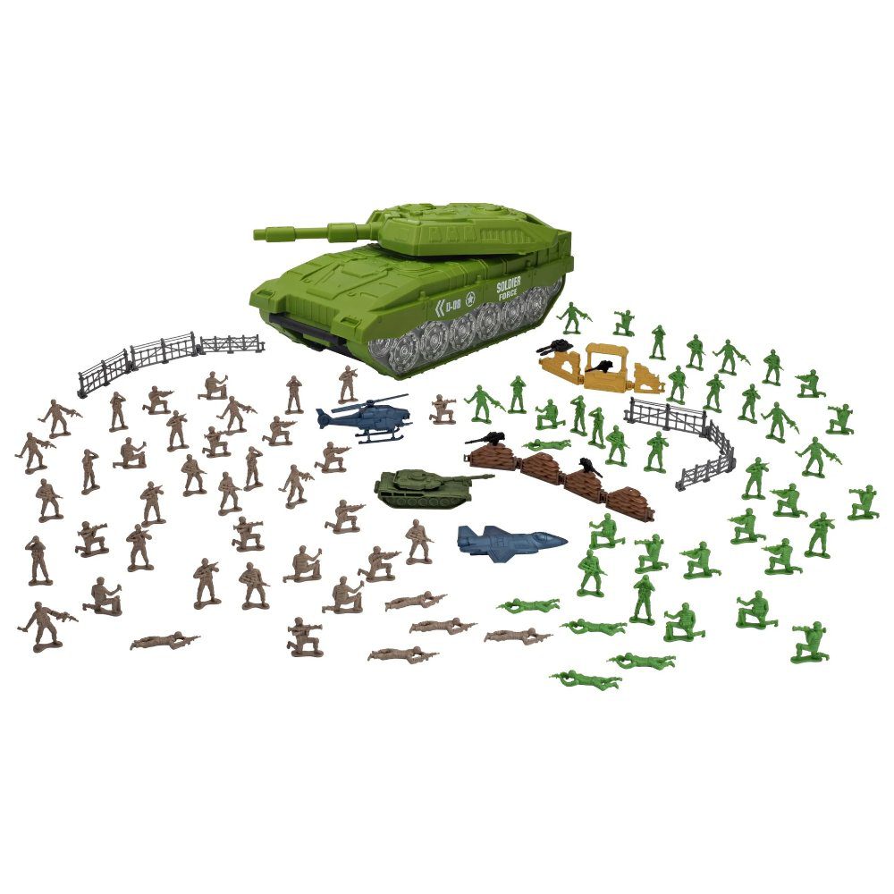 Take command with the Soldier Force Mission Troops Ultimate Battle Bucket! Packed with soldier figures, vehicles, and accessories, this playset lets kids lead their troops into action and recreate epic battles anytime, anywhere.The massive tank features a spinning gun turret and opens up to store all the included pieces inside. From soldiers and mini-tanks to helicopters, fighter jets, bunkers, and fences — this all-in-one set has everything needed for non-stop combat fun!