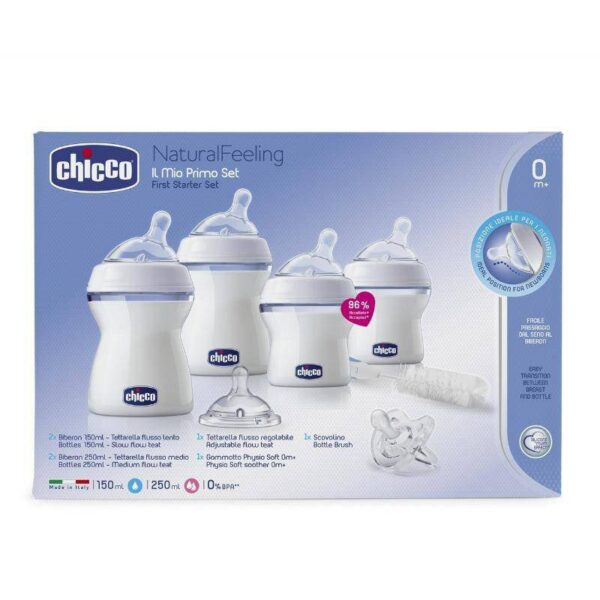 The Chicco NaturalFeeling Large Baby Set offers everything you need to meet the needs of mothers and newborns, offering all the exclusive innovations of the series, starting from the ultra soft “mother effect” silicone teat that facilitates breast bottle alternation. The Chicco NaturalFeeling Large Baby Set contains:Four NaturalFeeling baby bottles (two 150ml and two 250ml bottles),for a natural serene lactation.A straight teat with adjustable flow.A Physio Soft 0m + soother for a comfortable suction.A practical bottle cleaning brush.