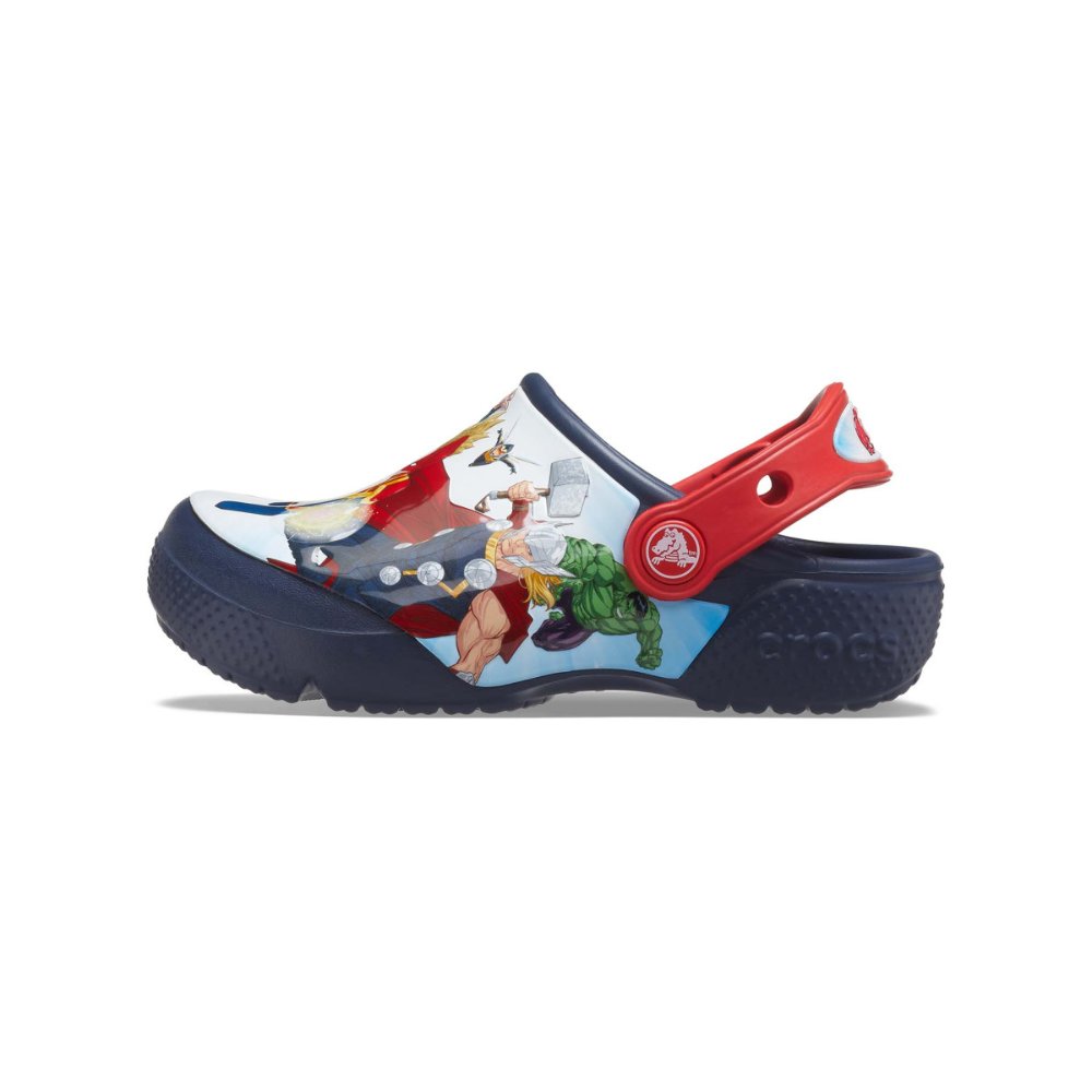 Designed for little Marvel fans, this clog features bold Avengers graphics and a comfy, secure fit that?s perfect for school, playdates, or epic adventures. Made with Croslite for lightweight support, comfort, and durability, it includes a rotating heel strap to keep up with every mission. With original licensed designs from Crocs Fun Lab, kids can show off their favorite heroes in style?because every little hero deserves a shoe as bold as they are.