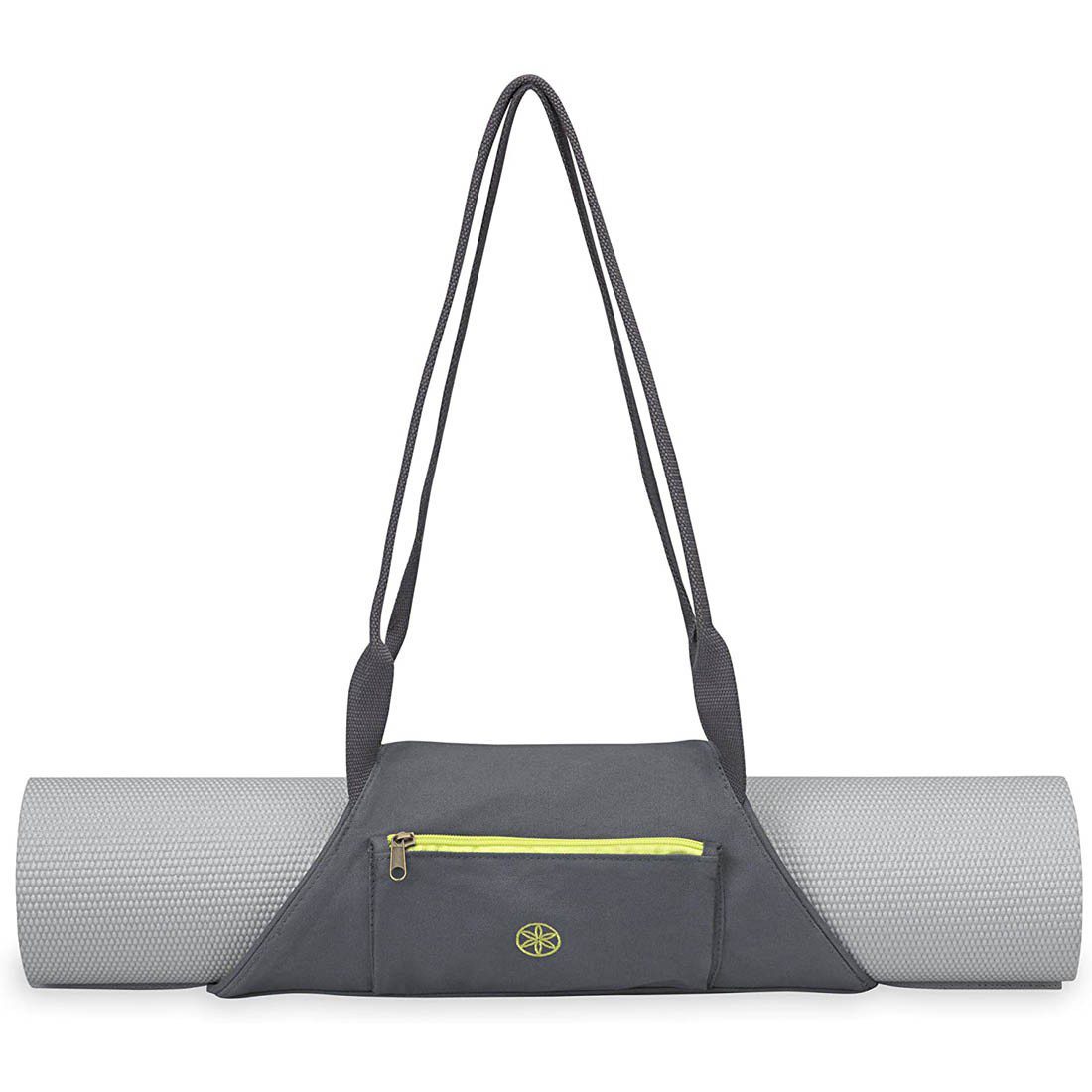 This simplistic mat bag allows you to carry your mat with ease and features two thin shoulder straps, an exterior expandable zipper pocket, and room to fit most mat sizes.