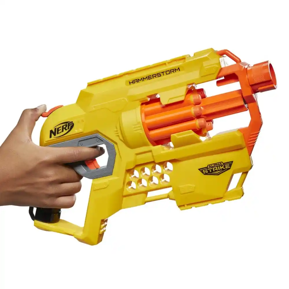 Nerf Alpha Strike Hammerstorm Blaster is a dart-firing toy gun from Hasbro designed for action-packed play. It is known for its ease of use, making it suitable for beginners to the Nerf brand, as well as a good addition to any existing collection