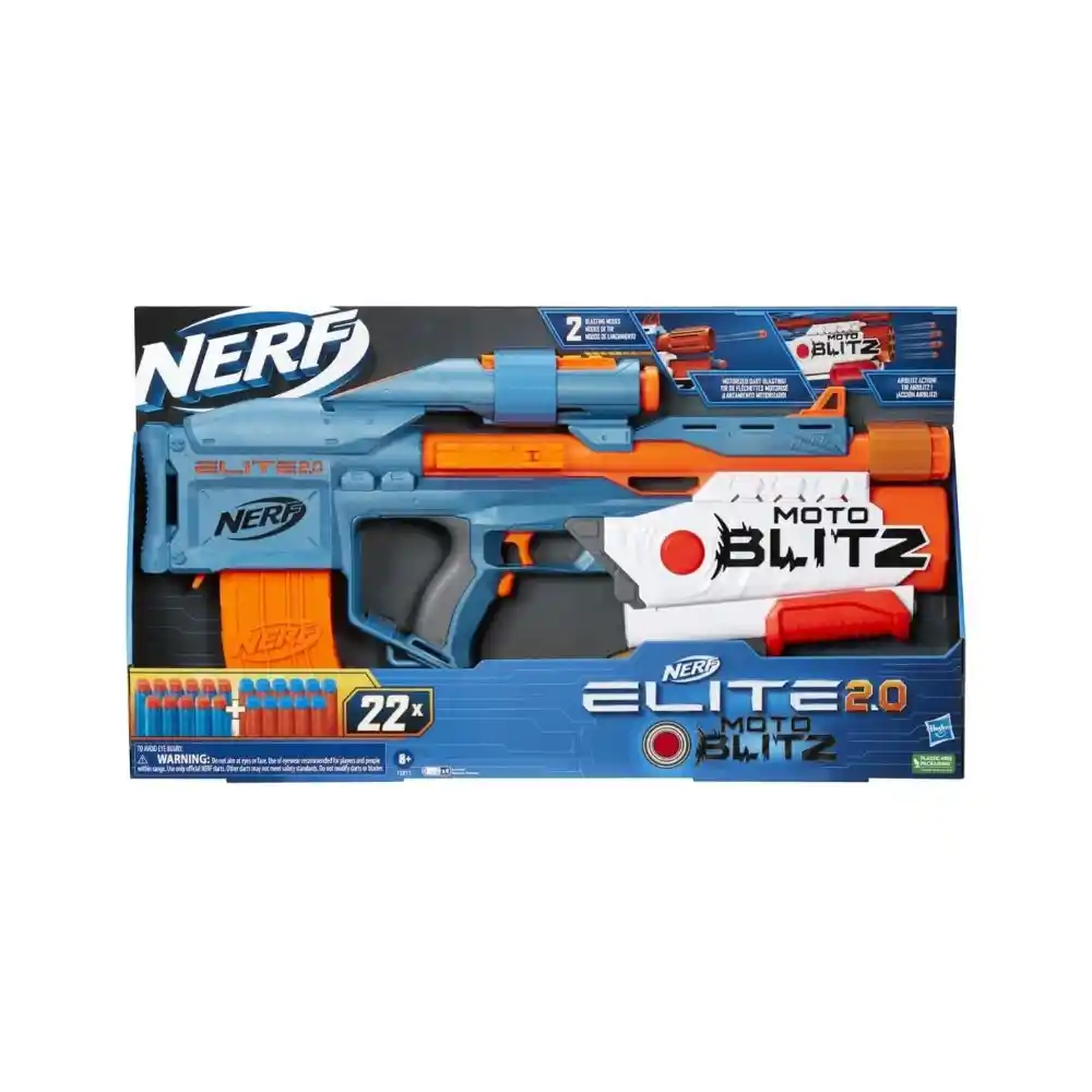 Gear up for action with the Nerf Elite 2.0 Motoblitz Blaster, featuring a bold design and powerful dual-launch modes! Choose between Airblitz mode to unleash 6 darts at once using pressurized air, or motorized mode to fire 10 darts in rapid succession. With its eye-catching colors and unique shape, this blaster is built for epic Nerf battles and unstoppable fun. Load, aim, and dominate every adventure with unbeatable firing power!