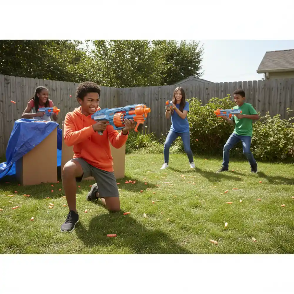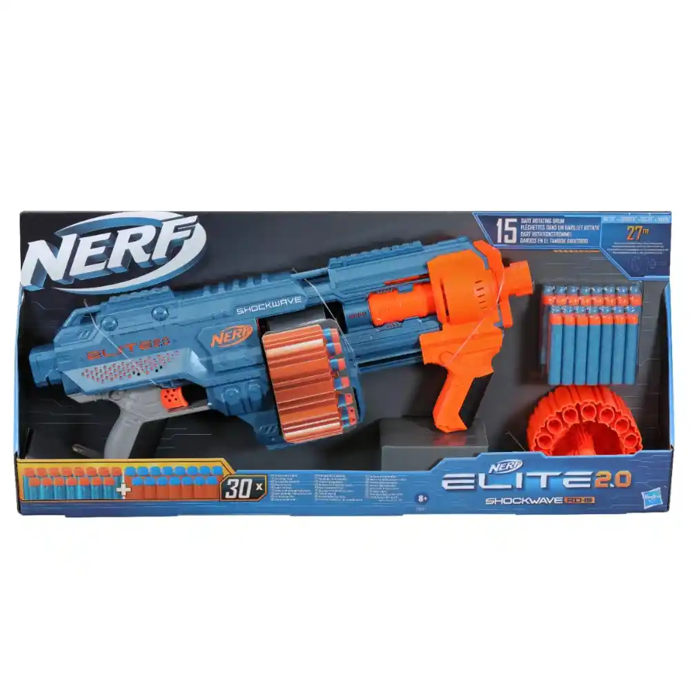 Arm yourself with the Nerf Elite 2.0 Shockwave RD-15 blaster and get ready for battle! Designed with built-in customization options, this blaster lets you upgrade your weapon and gain an edge in any Nerf competition. The Shockwave RD-15 features three tactical rails and attachment points for the barrel and stock, allowing you to optimize your setup for every mission. Fire a single dart by pulling back the blaster’s slide and pressing the trigger, or launch all 15 darts rapidly by holding the trigger and sliding repeatedly. The set includes 1 blaster, a rotating drum, 30 darts, and instructions, giving you everything you need for fast-paced Nerf action.