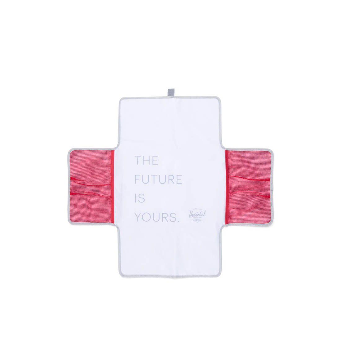 Folding easy-wipe changing mat with reinforced mesh wing pockets.