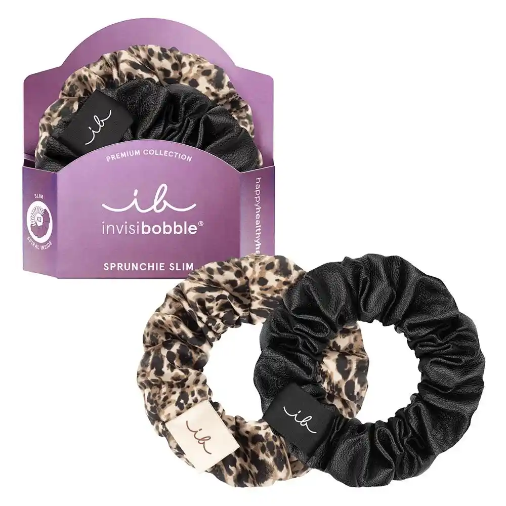 Add a touch of luxury to your look with the invisibobble SPRUNCHIE SLIM Leopard Is the New Black duo from the premium collection. Featuring a sleek black leather optic and a soft, stylish leopard pattern, these high-quality scrunchies bring effortless elegance to any outfit.Perfect for both casual days and special occasions, they keep your hair secure, comfortable, and perfectly on-trend. Stay chic with invisibobble—where style meets sophistication.