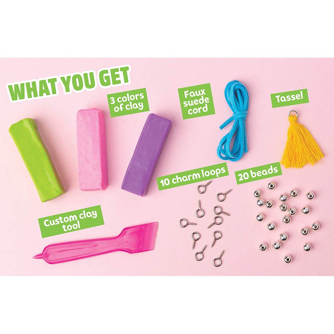 Includes a custom clay tool, faux suede cord, metallic beads, and a pre-made tassel to make your charm bracelets look super polished.