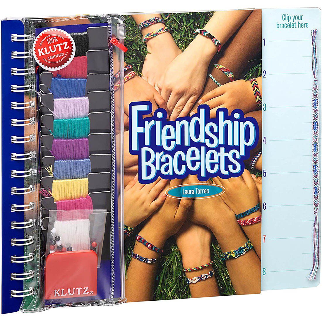 Comes with 10 skeins of embroidery floss, beads, plastic Klutz clip.