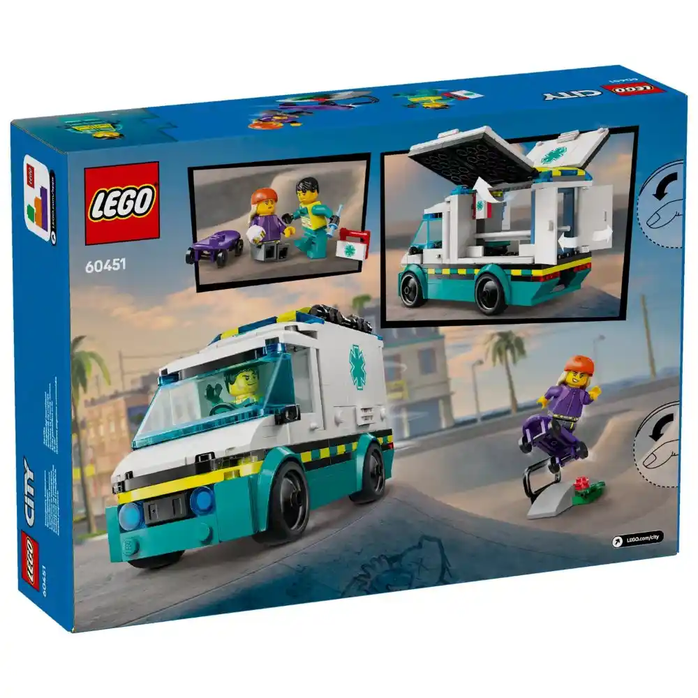 Kids can dive into exciting rescue missions with the LEGO City Emergency Ambulance (60451) playset, designed for ages 5 and up. This detailed toy ambulance features fold-up side panels and opening rear doors for easy access to the stretcher and medical equipment, including a toy syringe, bandage, and medic bag. The set also comes with a skateboard, a skate ramp, and skateboarder and paramedic minifigures, sparking endless role-play and storytelling fun.To enhance the build, the set includes a step-by-step printed guide and interactive 3D instructions in the LEGO Builder app, where kids can zoom, rotate, and track their progress. A great addition to the LEGO City range, this set lets young builders explore the world of emergency rescue through imaginative play.
