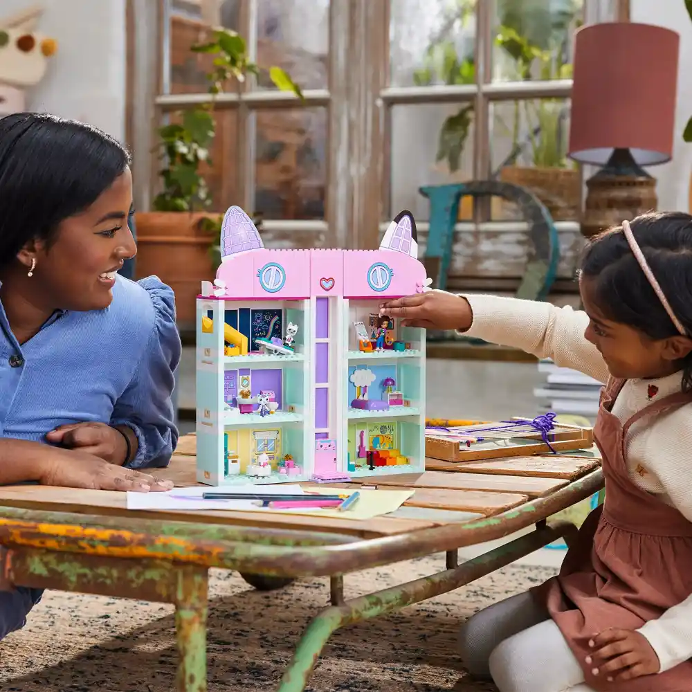 Explore every floor of Gabby’s Dollhouse with this colorful LEGO® set, featuring 8 unique rooms connected by a sliding elevator. Each room is packed with fun activities, from baking in the kitchen and sliding in the playroom, to creating in the art room, playing the piano in the music room, pampering in the bathroom, napping in the bedroom, or partying on the rotatable rooftop dance floor. Kids can share adventures with 4 beloved characters from the show—Gabby, Pandy Paws, Cakey and MerCat. The set includes a picture-story building guide, access to the LEGO Builder app with intuitive zoom and rotate tools, and a large Starter Brick so building fun begins immediately. Designed for families to enjoy together, this set is ideal for children aged 4+ to explore creativity, role-play and developmental milestones.