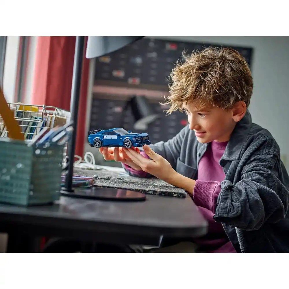 The LEGO Speed Champions Ford Mustang Dark Horse Sports Car set contains 344 pieces, letting builders recreate the sleek Mustang Dark Horse with authentic details and racing decals. The set includes a driver minifigure, offering kids hands-on fun and imaginative high-speed play.