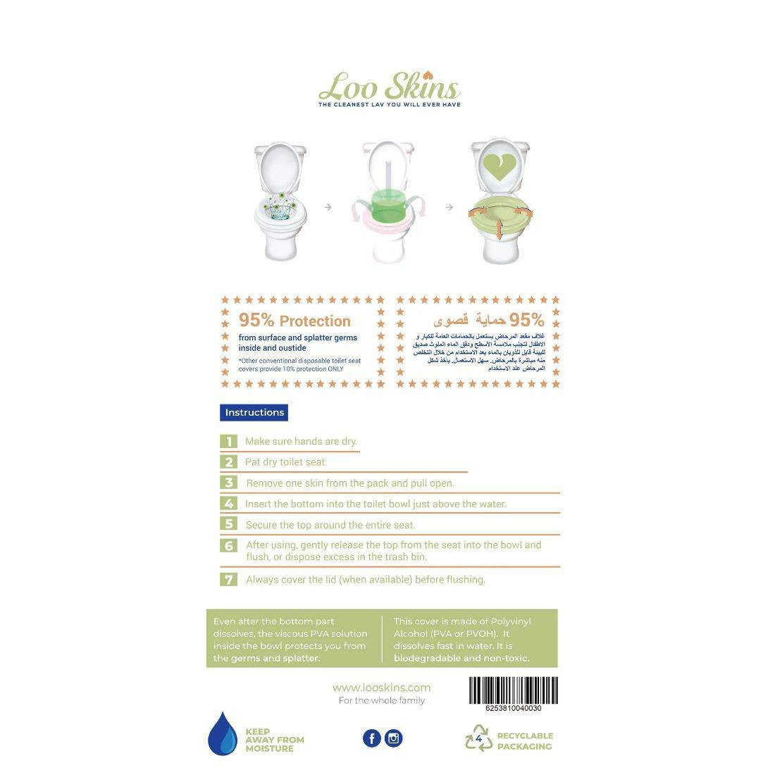 Because toilet splatter is infectious and conventional toilet seat covers protect you from the seat ONLY. Loo Skins protect you and your family from transmissible pathogens present inside the toilet bowl and 95% of surfaces of various public toilets. Anti-splash, easy to carry and apply, water soluble & flushable.