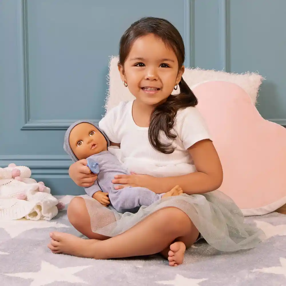 This 14-inch baby doll features cute details and friendly features, including expressive hazel eyes, soft-to-touch eyelashes, and a huggable soft body perfect for sweet cuddles.Little hands can easily remove baby’s jumpsuit and matching hat during changing time, while the included pacifier lets kids soothe their baby doll during imaginative role-play.
