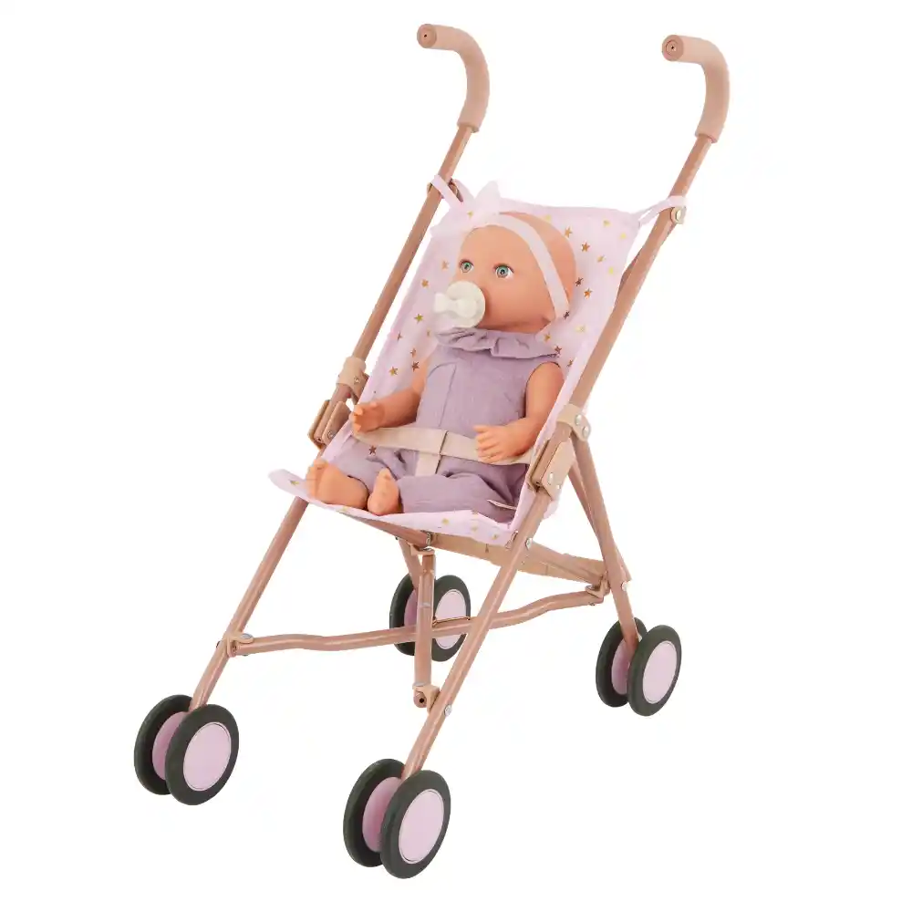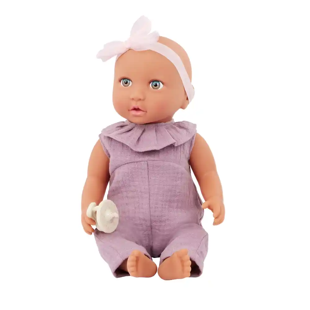 This 14-inch baby doll is made with realistic and friendly details to delight little ones during imaginative role-play. It features expressive blue eyes, sculpted hands and feet, and a cuddly soft body perfect for little hugs.Baby’s removable jumper, matching headband, and pacifier let kids explore dress-up, gentle soothing, and nurturing play, encouraging creativity, empathy, and storytelling.