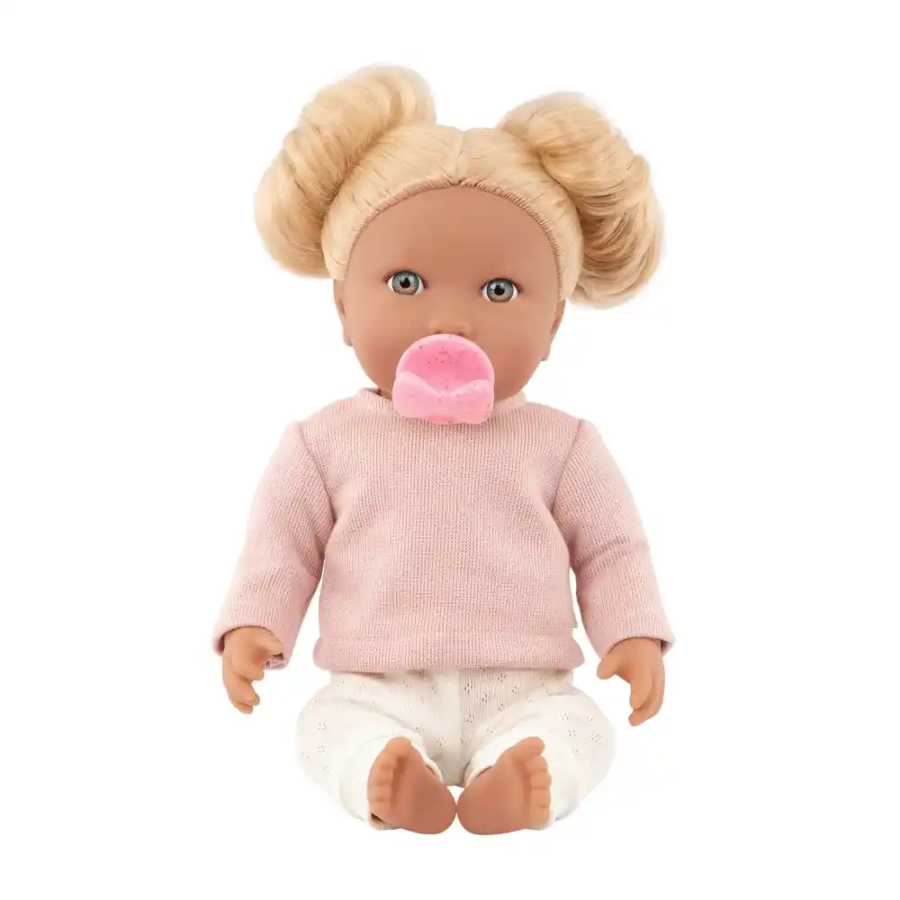 This 14-inch baby doll features wavy blonde hair for styling, bright blue eyes, and a soft, cuddly body perfect for little hugs.Kids can explore fashion fun and imaginative storytelling with baby’s cute sweater and pants outfit. Easy-open closures make dressing and changing simple, while the pink pacifier fits in baby’s mouth for soothing role-play.