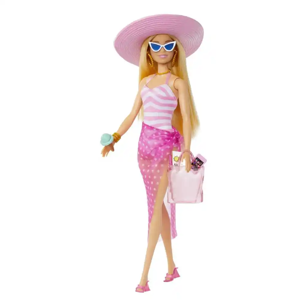 Barbie is ready for sunny adventures in style. Dressed in a chic pink and white striped swimsuit with a sheer polka-dot sarong tied at her waist, she’s the picture of seaside glam. Golden hoop earrings and peep-toe sandals complete her breezy summer look.To top it off, Barbie comes with fabulous accessories — a wide-brimmed sun hat, cat-eye sunglasses, a golden necklace, and a stacked bracelet — perfect for endless beachside storytelling and fashionable fun under the sun!