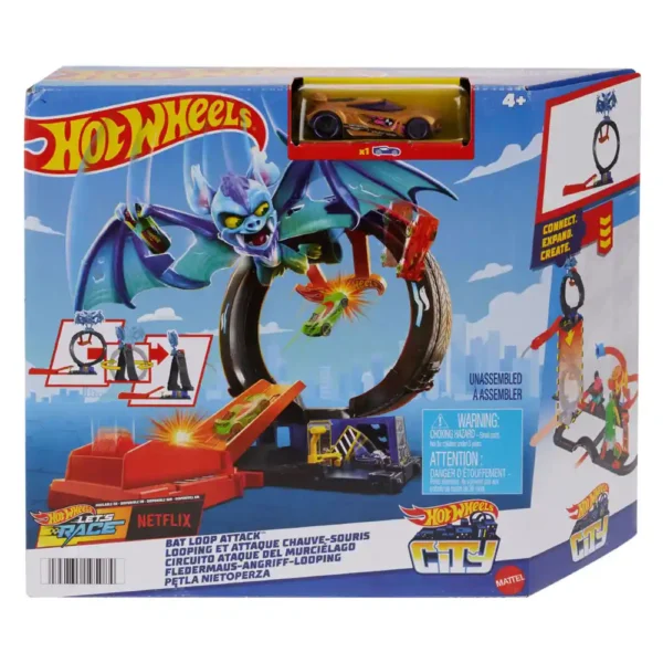 A wild bat has swooped down on the Hot Wheels City Tire Shop, just like in the Netflix series Hot Wheels Let’s Race! It’s up to young stunt drivers to launch into action and take it out!.Race your car through the awesome loop to knock out the bat, or adjust the launcher for a direct hit. Prefer to dodge danger? Speed under the loop to escape the creature and continue your high-speed adventures through the city!.Connect this set to other Hot Wheels City tracks and playsets to build an even bigger world of action and imagination.Includes: 1 Hot Wheels 1:64 scale vehicle (colors and decorations may vary).