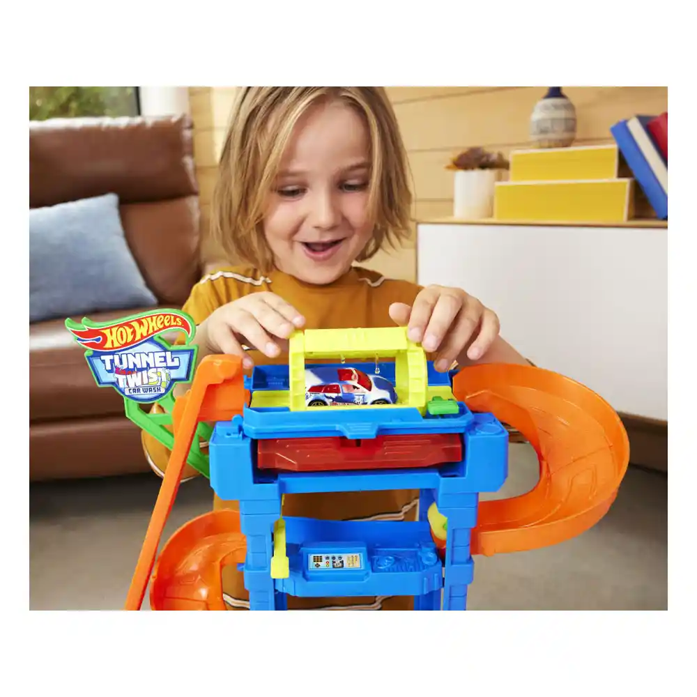 Make car wash time epic with the Hot Wheels City Car Wash with Spinning Tunnel! Drive the included Color Shifter car up the self-controlled elevator, through the spinning water-spraying tunnel, and watch its colors change instantly. Then zoom down the ramp, past the foam rollers and vacuum, for a full car wash adventure!
