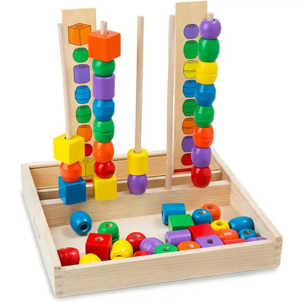 Stack the brightly colored beads onto five hardwood dowels to complete the patterns on the included cards! With more than 46 vibrant wooden beads and five double-sided pattern cards, this engaging set helps kids build matching, sequencing, and fine motor skills. The sturdy wooden storage box keeps all the pieces organized and holds the dowels upright for easy, hands-on play. The 10 patterns progress in difficulty, offering a fun and rewarding challenge as children learn and grow.