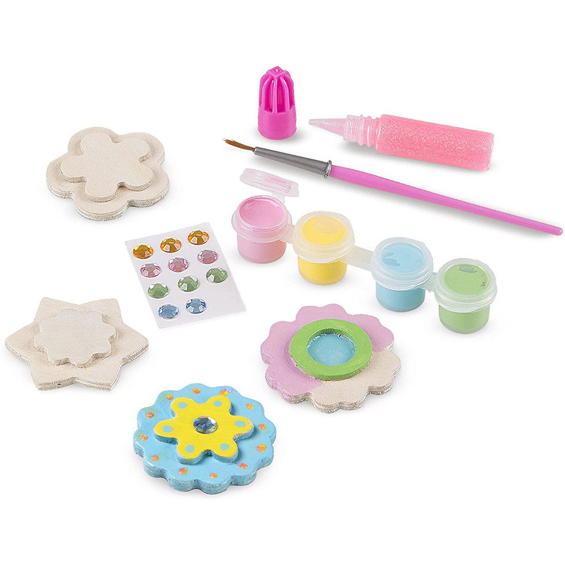 Add your unique personal touches to four wooden flower magnets to make original crafts inspired by you and your imagination! This all-inclusive kit includes four three-dimensional flower magnets in different designs, four pots of paint, a paintbrush, 12 gem stickers, and glitter glue to add extra sparkle. Fun for kids four and older to do on their own or with friends, these crafts make special keepsakes or gifts.