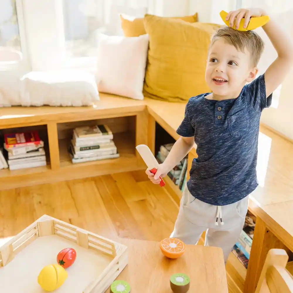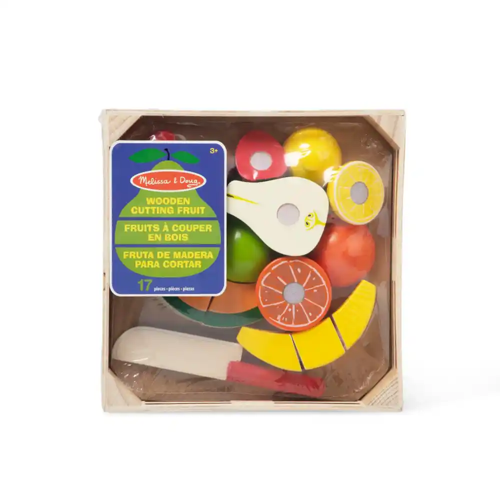 Who wants a piece of fruit? The Melissa & Doug Cutting Fruit Set is perfect for imaginative playtime! This wooden set includes a child-safe knife and seven pieces of sliceable fruit that can be cut into a total of 17 pieces. Held together with self-stick tabs, each slice makes a fun and satisfying “crunch” sound when cut.Crafted from high-quality wood and painted with realistic details, the set comes in a durable wooden storage box. Kids can spend hours pretending to make fruit salads, serve up juicy treats, and explore creative, hands-on play.