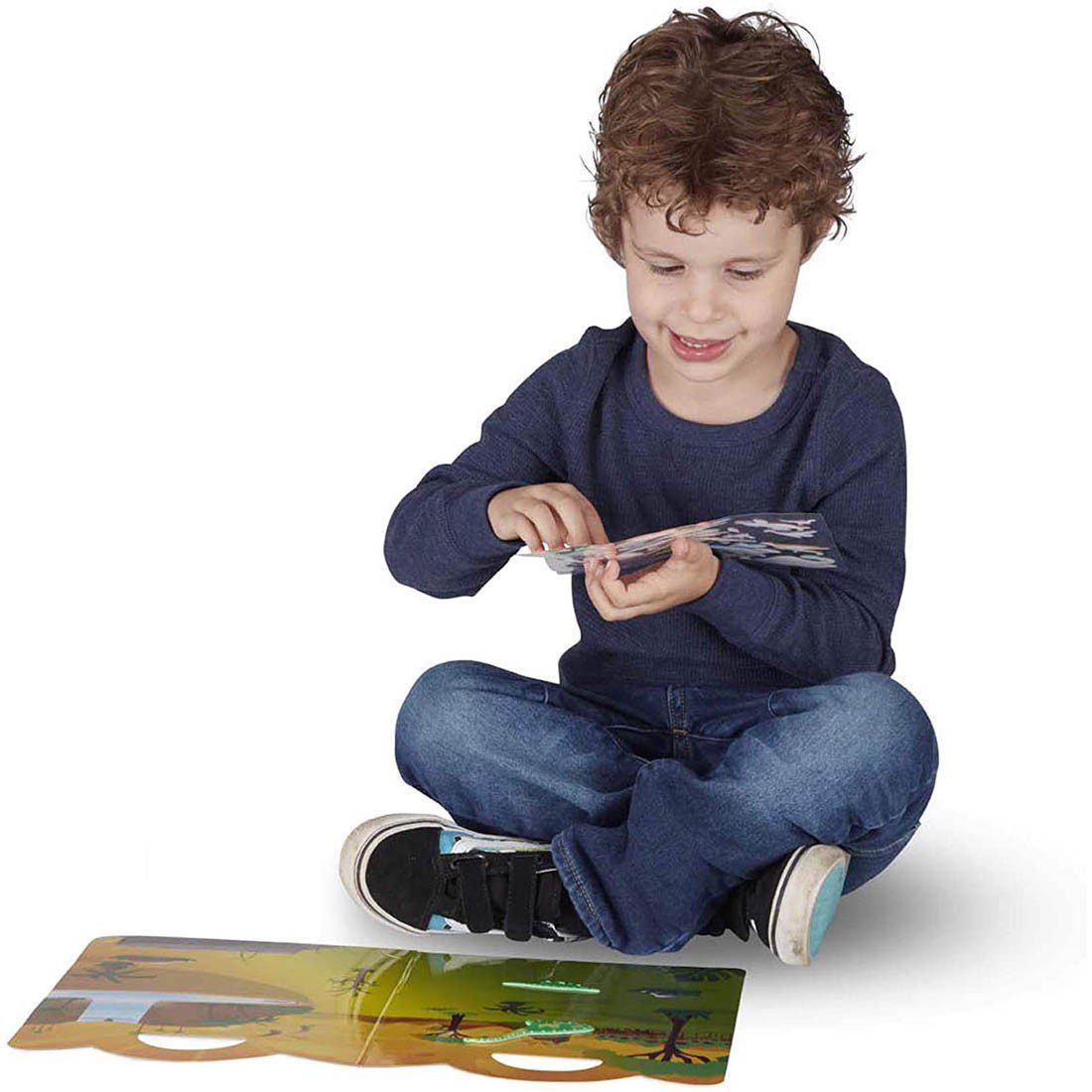 Double-sided glossy background with watering hole and waterfall scenes to fill again and again; convenient carrying handle–perfect travel activity for families on the go.