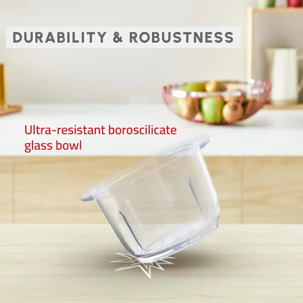 Durable glass bowl: Made from ultra-resistant borosilicate glass; shock-resistant and hygienic.