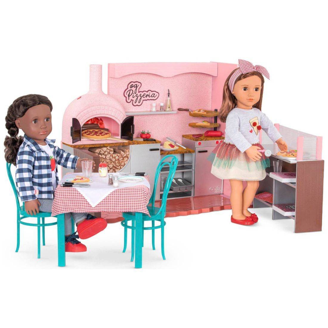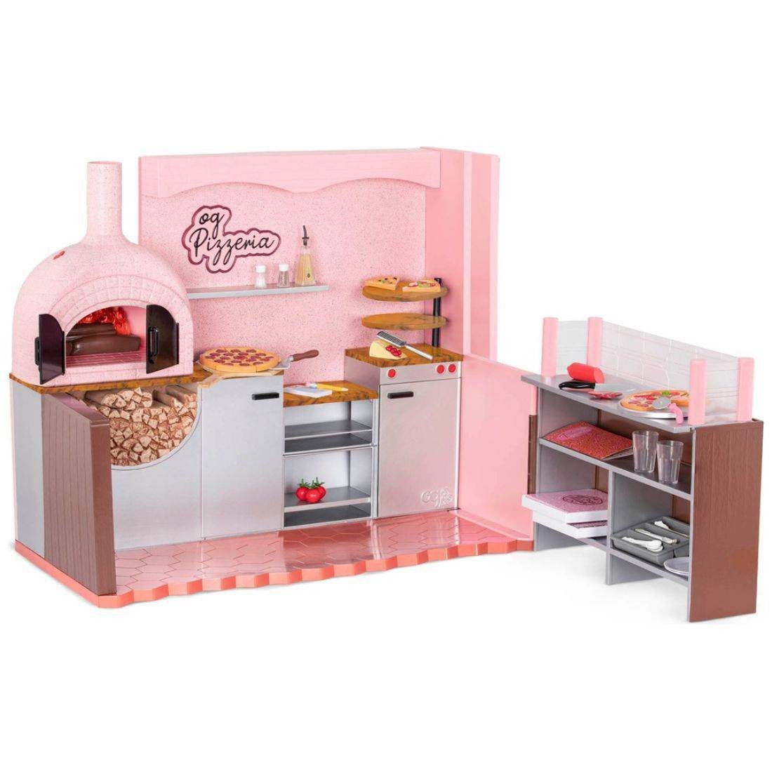 Serve up the tastiest pizza in the OG neighbourhood with the epic Easy Cheesy Pizzeria for 46cm dolls. Hand your guests a menu and jot down their order with your pencil and order pad. They want pepperoni and tomatoes on their pizza? No problem, you’ve got all the ingredients in the kitchen. When you have finished prepping the pizza, put it in the wood oven. Then press the button to light up the flames and hear the fire sound as you start cooking! Garnish your pizza with the Parmesan and Olive Oil. Use the rolling slicer to “slice” the pizzas and serve them to your besties. The 6 slices can be removed from both 2 pizzas so everyone gets a piece. Pizza boxes are at the ready for any takeaway orders, too easy!