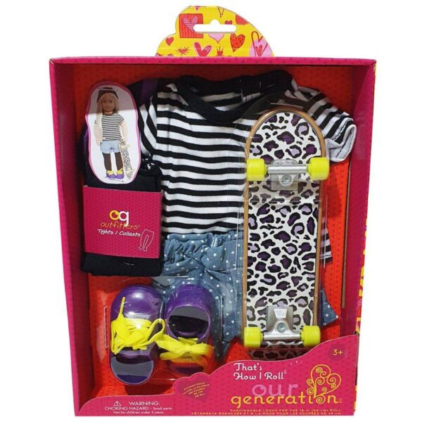 Hit the skate park with the Our Generation That’s How I Roll outfit for 18-inch dolls! The leopard-print skateboard will help your dolls perform grinds, half-pipes, and kick-flips – all in stylish ways! This hip and flashy outfit features a pair of shorts with fun polka dot prints, comfy leggings, and a casual striped T-shirt. Add the black and purple striped hat for a trendy skater look, and do-up the bright yellow shoelaces before it’s time to roll. This outfit also features velcro closures that make it quick and easy to put on and remove when mixing and matching with other fun clothing styles.