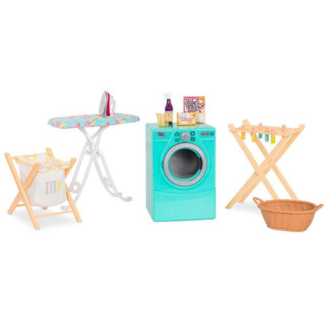 Playing house is even more fun with the Our Generation® Tumble & Spin laundry set for 18-inch dolls! This pretend-play accessory has everything your dolls need to keep their favorite outfits clean, pressed, and ready to impress! Grab your doll’s outfit in the hamper and slide it into the washing machine when it’s ready to be cleaned. Then, wind up the washer from the back to make it spin! Hang her clothes on the rack to finish drying, and use the iron and ironing board to get rid of any wrinkles. It even features laundry necessities like a box of dryer sheets, a measuring cup, laundry soap, and a spray bottle! (Dolls and outfits sold separately. Compatible with American Girl dolls).