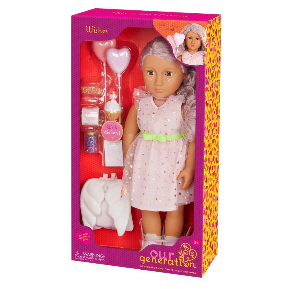 Let your imagination sparkle with Wishes, an enchanting 18‑inch doll who turns dreams into magical adventures. She has a soft, huggable body, starry freckles on her cheeks, and lifelike dark‑brown eyes that open and close—plus long wavy pink hair perfect for styling in all sorts of gorgeous ways!