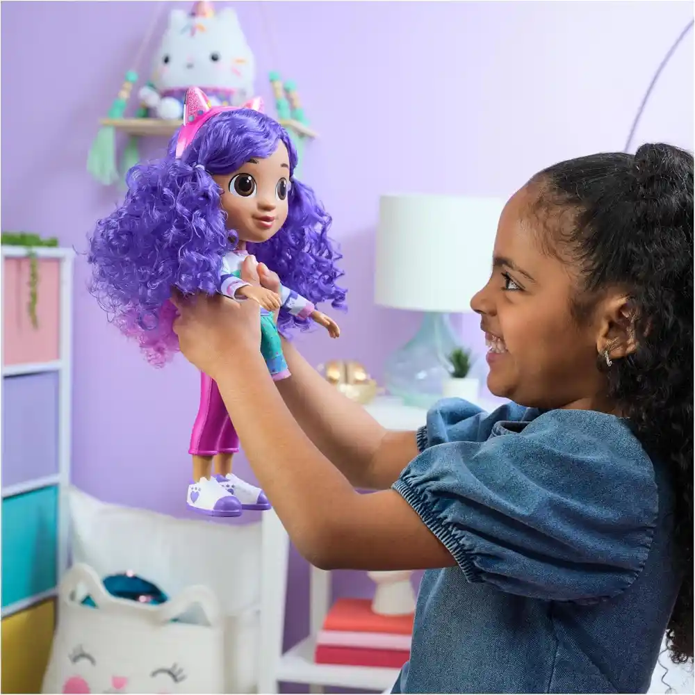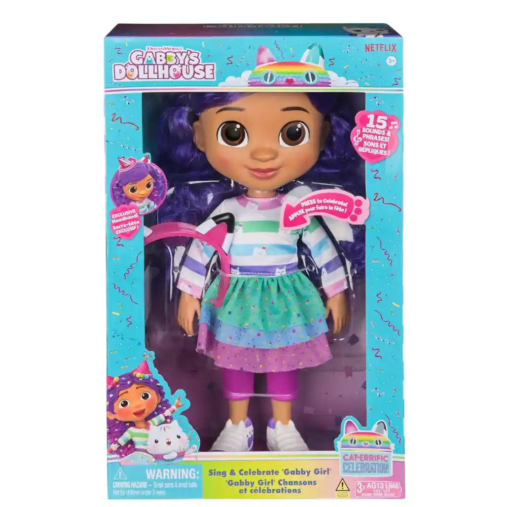 Create unforgettable pretend-play adventures with the Sing and Celebrate Gabby Girl Doll. Dressed in her exclusive celebrations-themed outfit, Gabby features a cute kitty hairband with reversible ears that twist from party-hat mode into her signature cat ears. Standing over 30cm tall, she’s the perfect companion from playful fun to naptime dreaming. Squeeze her chest to hear sound effects from the show, bringing each playtime adventure to life. Gabby’s Dollhouse toys are ideal gifts for fans of the hit Netflix series, encouraging imaginative play with collectible figures, accessories, and furniture. Kids can build their dream dollhouse worlds with essentials like a play kitchen or music room, and expand with exciting sets such as a cruise ship toy, mermaid-themed pool, or the Party Room Playset featuring a dolls house attic, indoor skate park, and adorable balconies with mini fidget toys—perfect for sensory play and compatible with both dolls house versions.