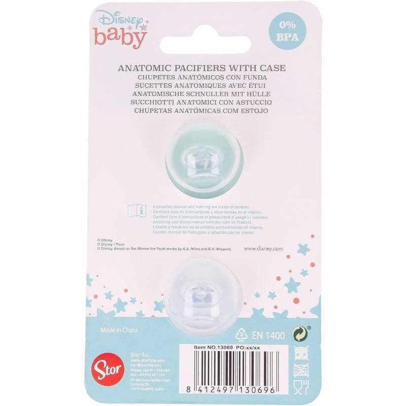 The pacifiers offer a soft, soothing feel adapted to the needs of older babies,They come with a practical case for optimal hygiene so they stay clean when not in use ,Since they are made without BPA, your baby’s safety and health is guaranteed during use,The Disney Baby Mickey Mouse design adds a touch of magic and familiarity to make sucking even more comfortable and soothing,Give your baby a soothing and comfortable sucking experience with these anatomically shaped silicone pacifiers