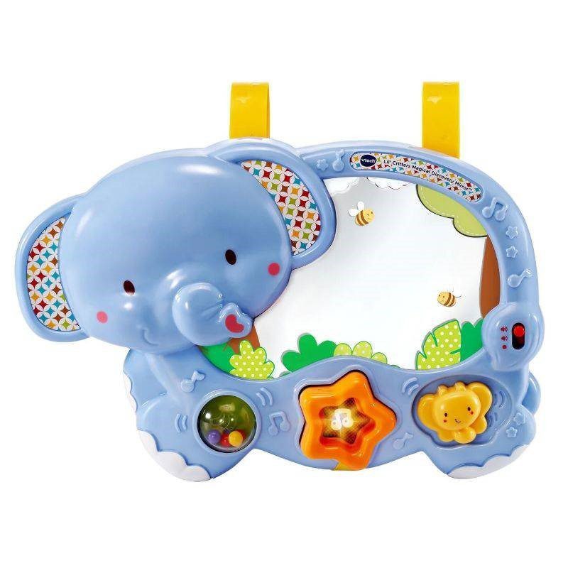 Introducing the Little Friendlies Magical Discovery Mirror by VTech! This cute little elephant mirror will provide plenty of discovery fun for your little one. Press the light up star button to discover the hidden monkey and lion! Pressing the light up star button will also play fun phrases, sounds, sing-along songs and melodies. The Little Friendlies Magical Discovery Mirror can attach to a cot and can also be played with on the floor thanks to its inclined back. The mirror features a rolling ball and spinning butterfly for baby to play with. Enjoy the 3 sing-along songs and 10 melodies. Light up star button displays animals on the mirror and plays phrases, sounds, songs and melodies.Features a rolling ball and spinning butterfly.Includes 3 sing-along songs and 10 melodies,The back of the mirror is inclined, making the mirror easier for baby to see.Hang on the cot, or play on the floor.