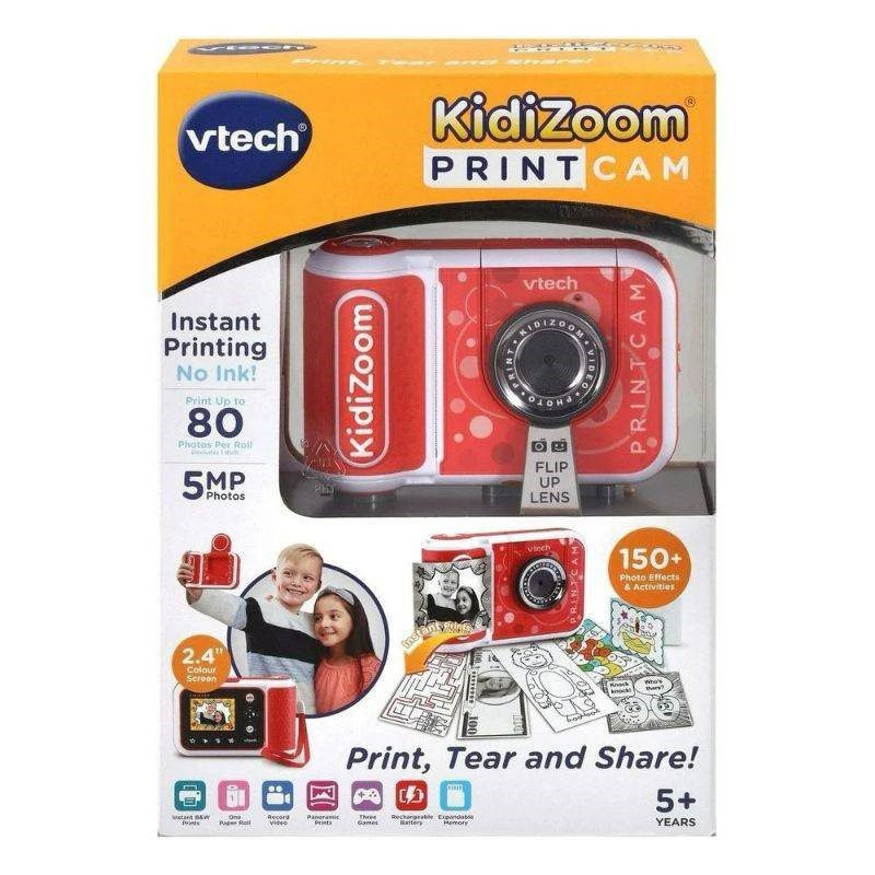 Take a photo and print it instantly with the KidiZoom Print Cam! The flip-up lens allows for easy selfies too. The camera is jam-packed with fun features like special photo effects, stamps and borders, 3 games, panoramic prints and comic strip maker. You can also turn your photos into line drawings to colour or use the print shop to print games, design and print your own cards, pretend money, accessories, and more. Also functions as a normal digital camera: you can take videos and save photos and videos and transfer by USB. Memory is expandable by microSD card (SD card not included).Take photos and selfies using the colour screen and instantly print up to 80 black and white images—that’s a pennies per print value; Kidizoom Print Cam Paper Refill Pack sold separately.Get creative and add effects, stickers, filters and borders to photos and videos; photos can be turned into line drawings you can colour.Explore 110+ templates and create comic strips, print games, design greeting cards, create custom play money and more.Play games between photo shoots; parent controls can set daily time and printing limits or turn off games.