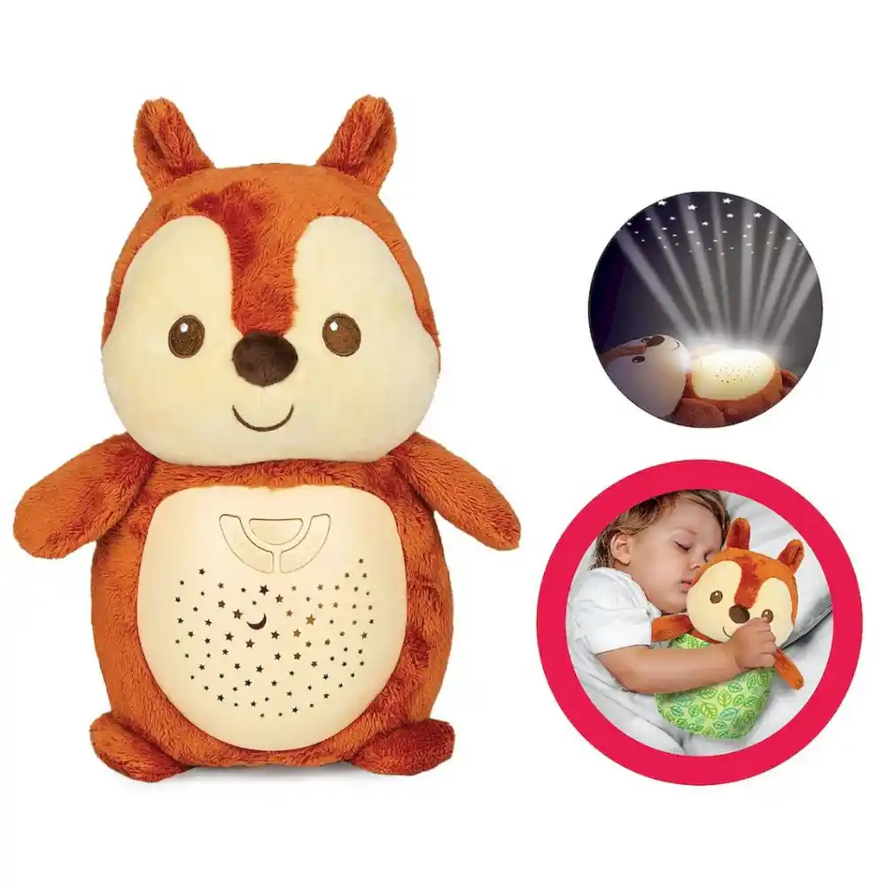 The 2-in-1 squirrel projector and nightlight creates a calming bedtime experience by projecting a soothing starry night sky. It emits a gentle glow in multiple colors and easily transforms into a soft, huggable nighttime companion for added comfort. With a simple press of the music button, it plays relaxing nature sounds or soothing lullaby music, helping little ones feel safe, relaxed, and ready for sleep.