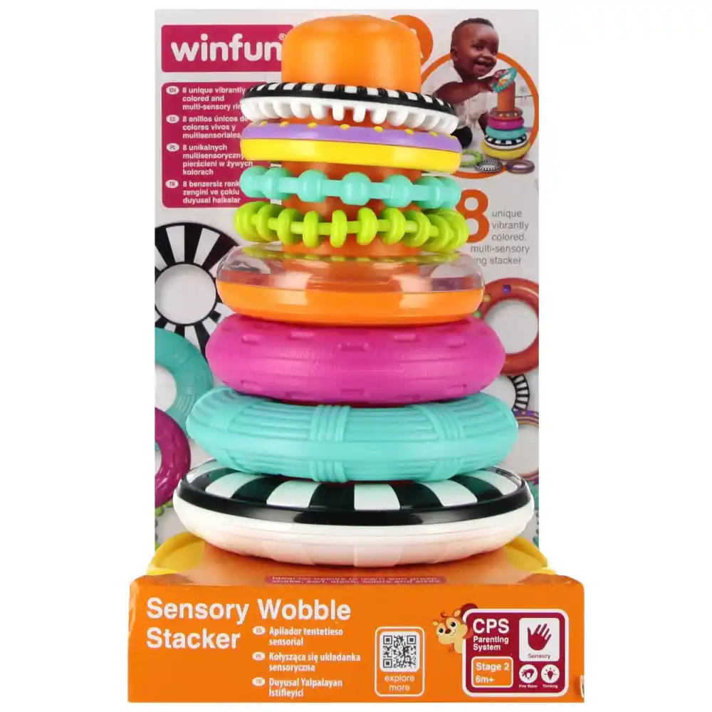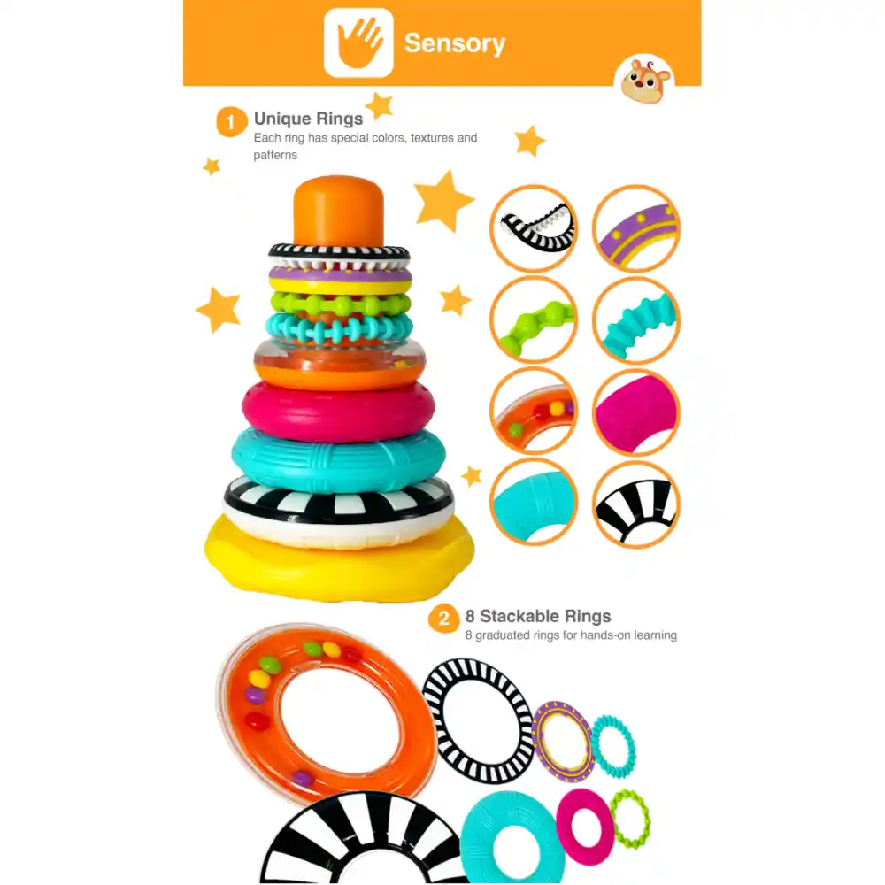 This vibrantly colored, multi-sensory ring stacker features eight unique rings with a variety of visual and tactile textures to engage and stimulate little hands. One semi-transparent ring filled with rattle beads adds extra sensory fun. Designed to help babies learn through grasping, shaking, sorting, stacking, and recognizing colors and sizes, it also includes a roly-poly base that provides delightful wibbly-wobbly play for endless entertainment.