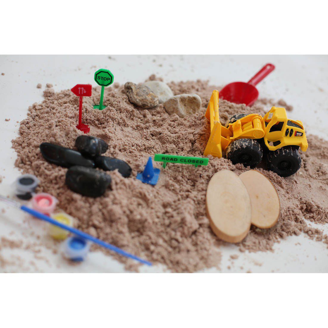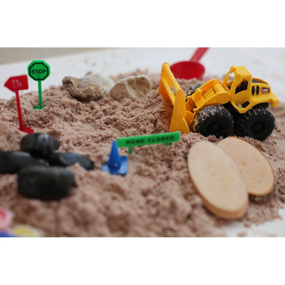 Contain 600g Moon dough sand, combination of rocks, loader truck, road signs, tree wood pieces, colors and brush.