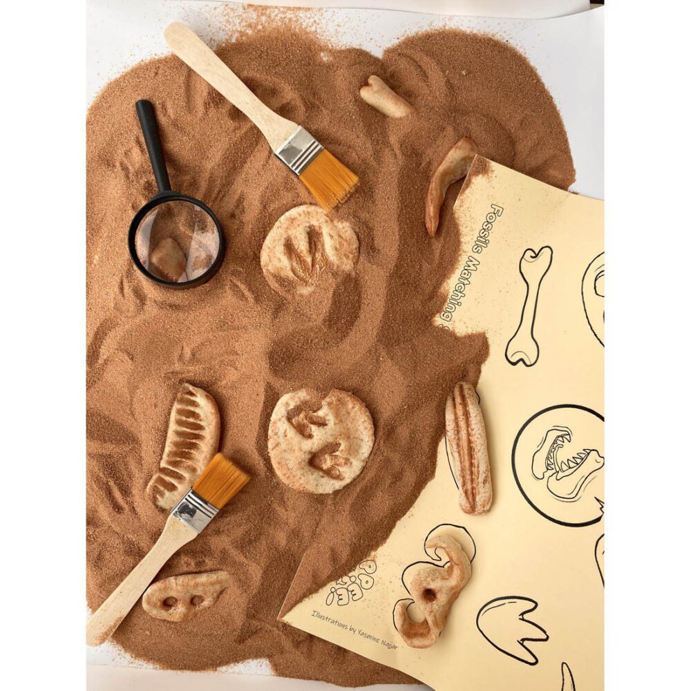 Kids love digging and exploring! Introducing dinosaur fossil kit by Rahma. Let your kids enjoy a variety of textures while brushing off the sand and using the magnifier to find the dinosaur skeletons.