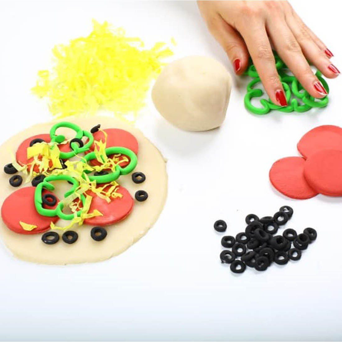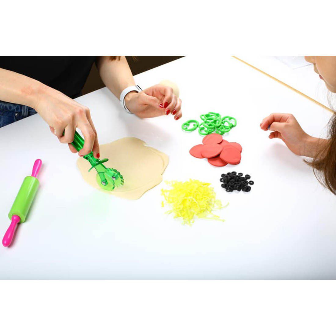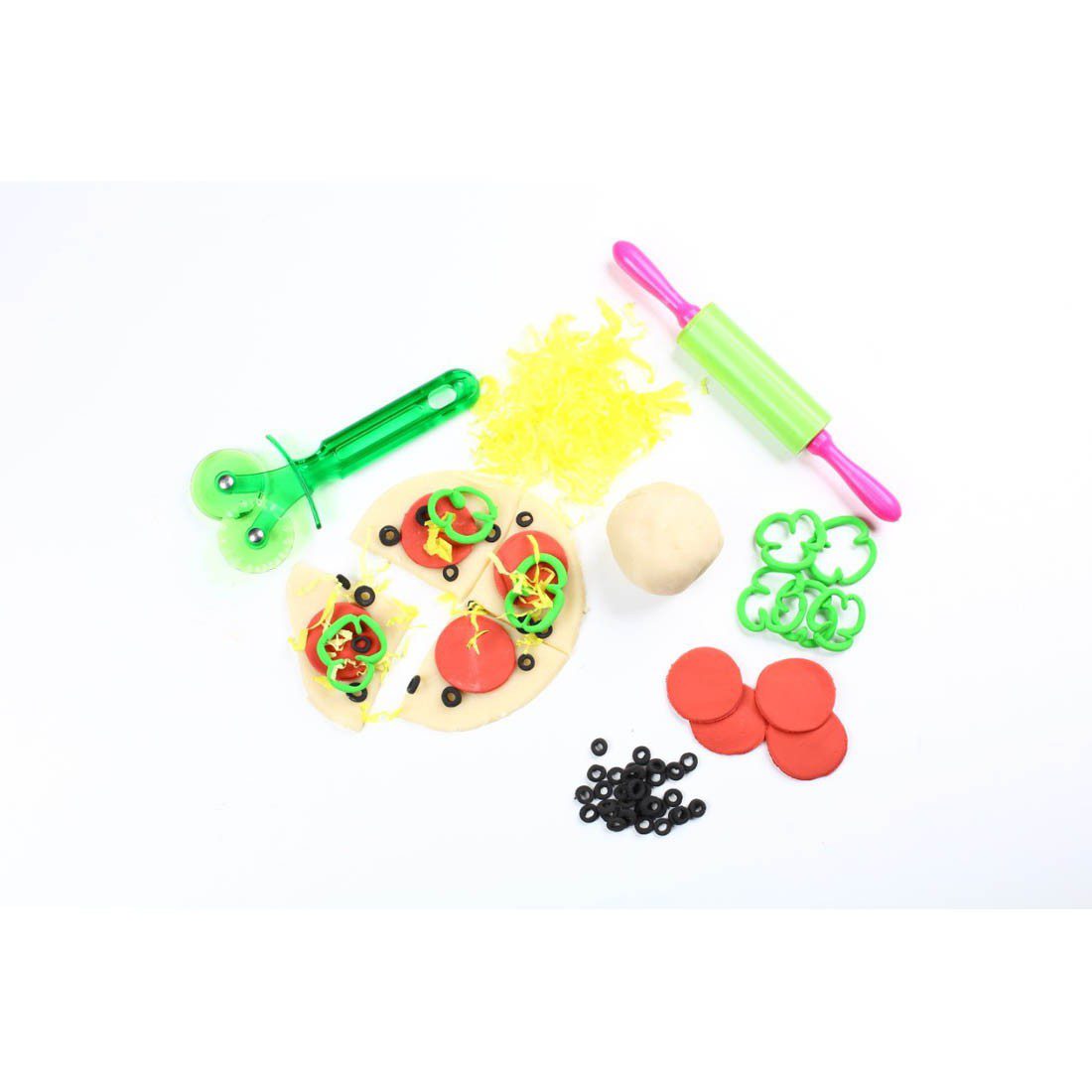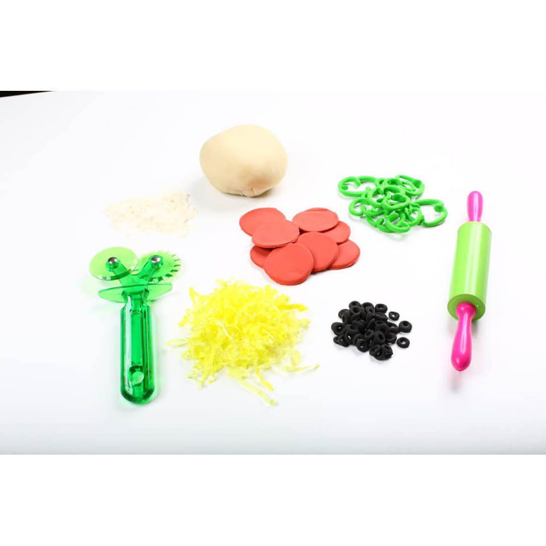 Contains 250-gram pizza dough, pepperoni, green pepper, black olives, shredded cheese, flour, rolling pin, cutter.