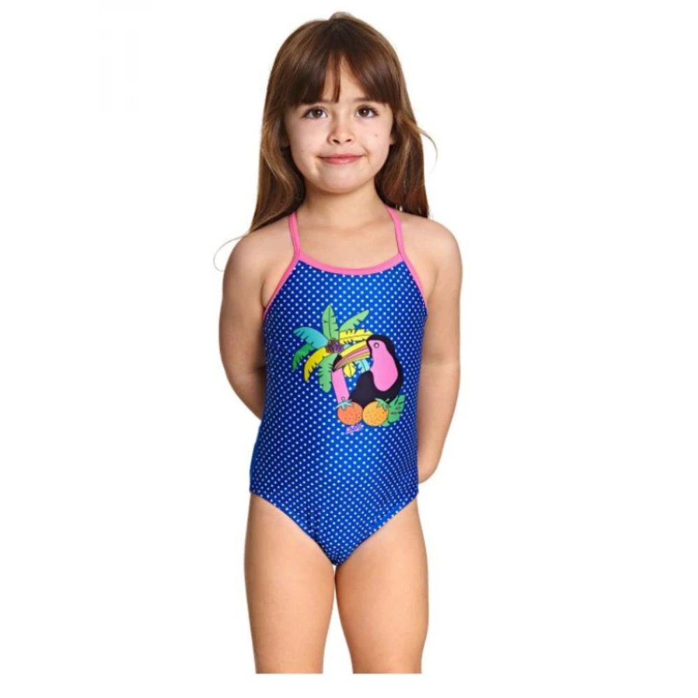 Every swim becomes a celebration in the Zoggs Pool Party Tex Back Swimsuit! Bursting with fun fruit prints and playful flamingoes, this vibrant one-piece is perfect for little ones who love color and excitement at the pool.Designed with slim blue shoulder straps for easy on-and-off, this swimsuit ensures comfort and freedom of movement during every splash and dive. Crafted from Zoggs? Ecolast fabric, it?s not only soft and quick-drying, but also chlorine-resistant and eco-friendly?made using recycled materials for a more sustainable swim.Perfect for girls up to 6 years old, the Pool Party Swimsuit is all about comfort, style, and fun.Make a splash and swim happy with Zoggs.