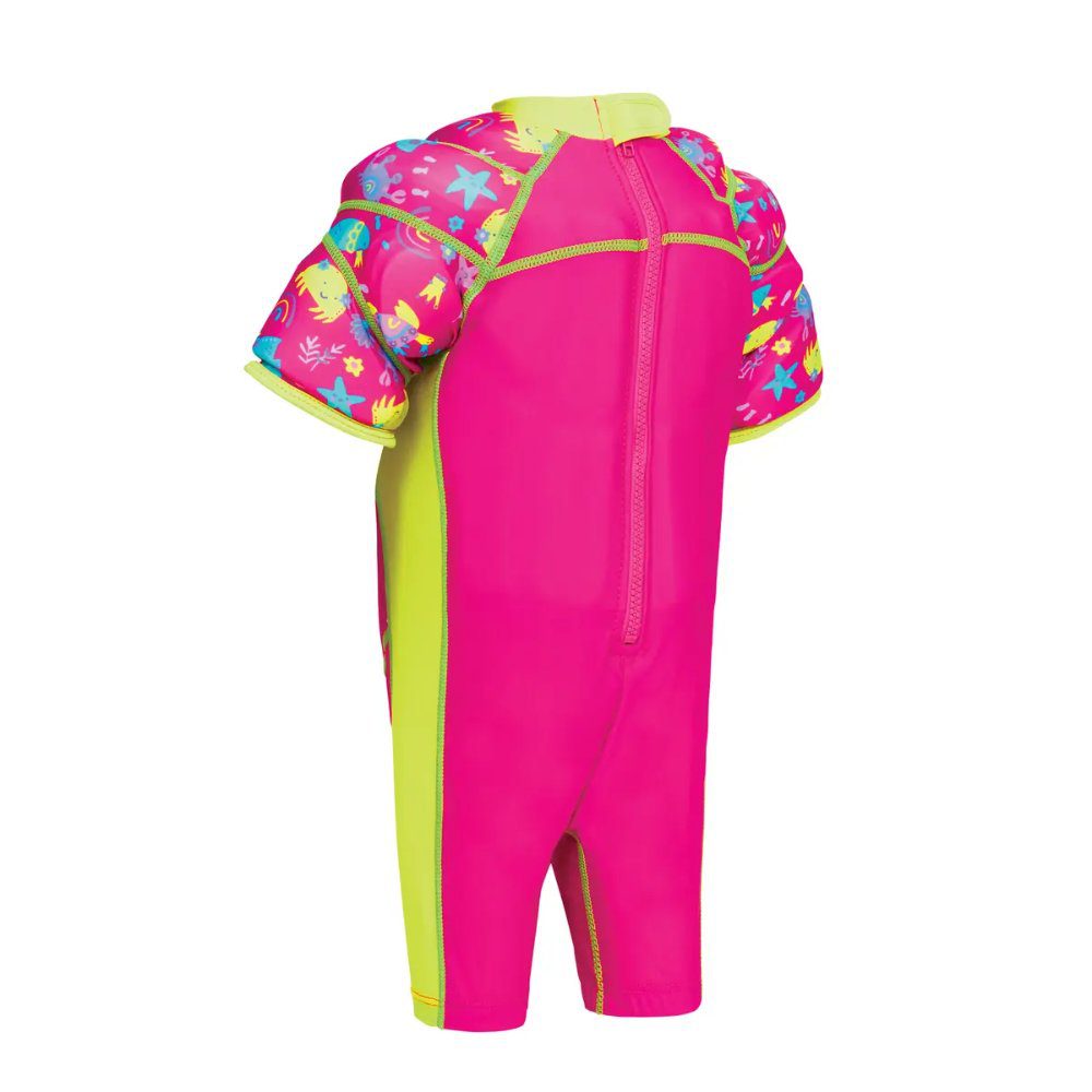 Zoggs Sea Queen Water Wing Float Suit provides adjustable puncture proof buoyancy in an all-in-one Float suit. Its unique design encourages a natural swimming position to get little ones used to using their arms and legs to move around in the water. Our float suit has removable pads for adjusting swim buoyancy as well as a secure back zip with tab to safely hold the zip in place. This also makes the Sea Queen Water Wings Float Suit super easy for parents to put on and take off. It also has UPF 50+ sun protection too! The Water Wings Float Suit is perfect for children Learning to Swim ( Stage 2 of Swim Development ) and is ideal for children to use in between learn to swim lessons. Available for ages 1 – 5 years or up to 25kg