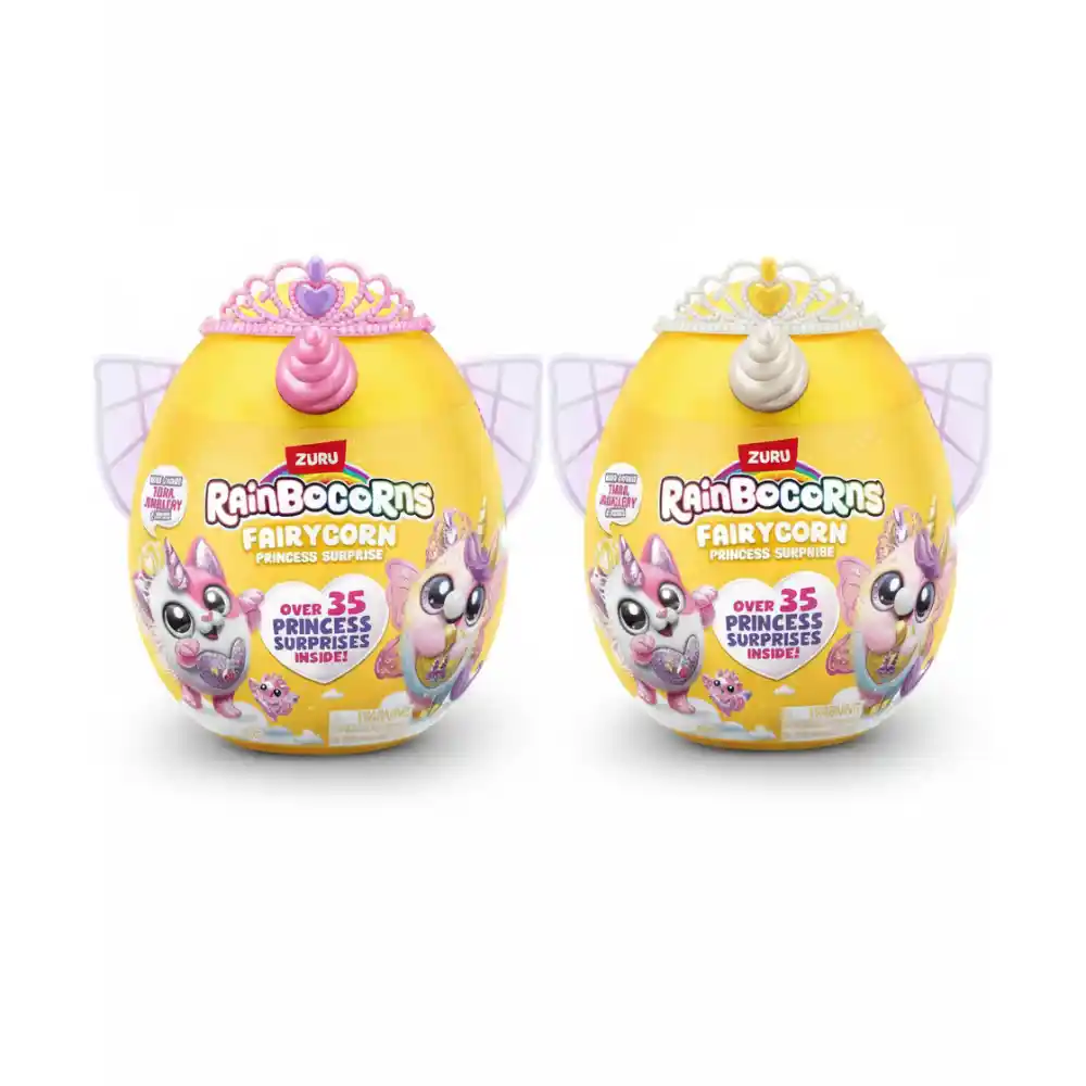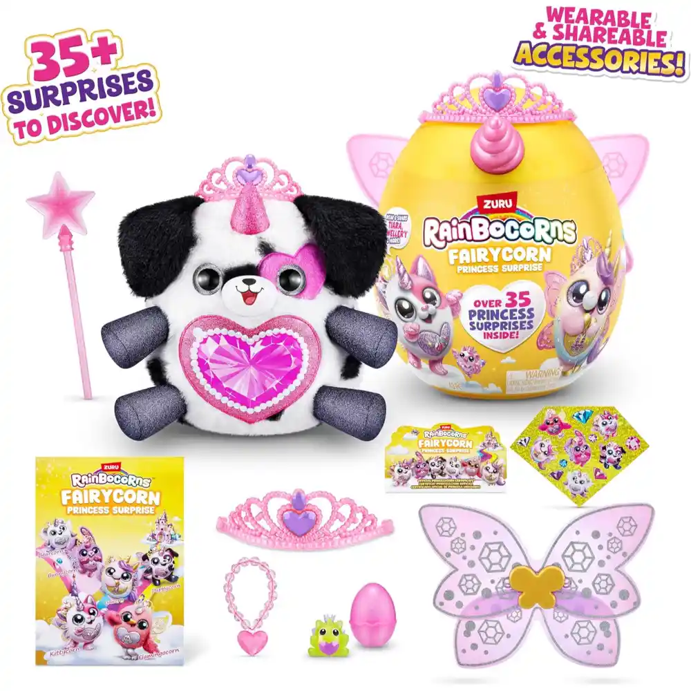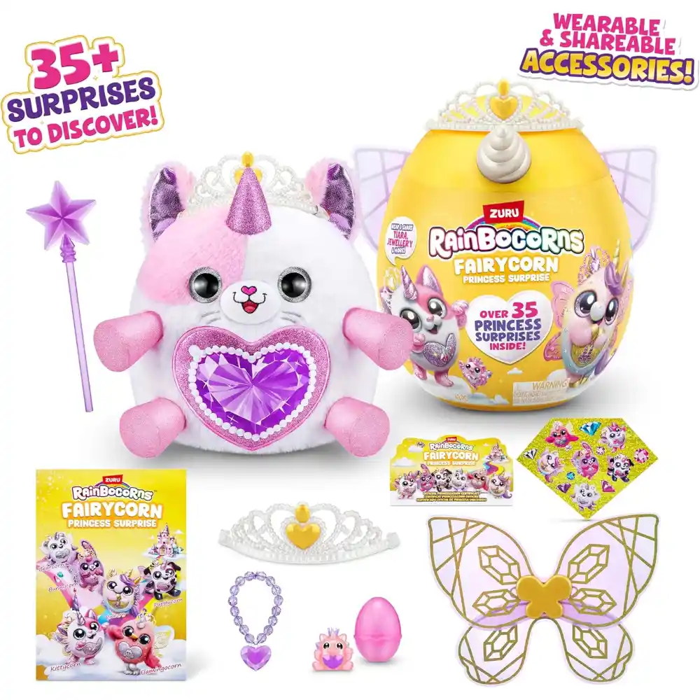 Meet the Rainbocorns Fairycorn Princess Surprise — where magic and royalty come together! These Fairycorns are true princesses, packed with over 35 surprises to unbox, including a sparkling tiara and magic wand. Share the accessories with your Rainbocorn to transform you both into Fairy Princesses! Each cuddly plush also comes with wearable wings, so you can match your new magical best friend. There are 6 Fairycorn Princesses to collect, each featuring a peel-and-reveal heart that shows what your Rainbocorn loves most. Character received may vary.