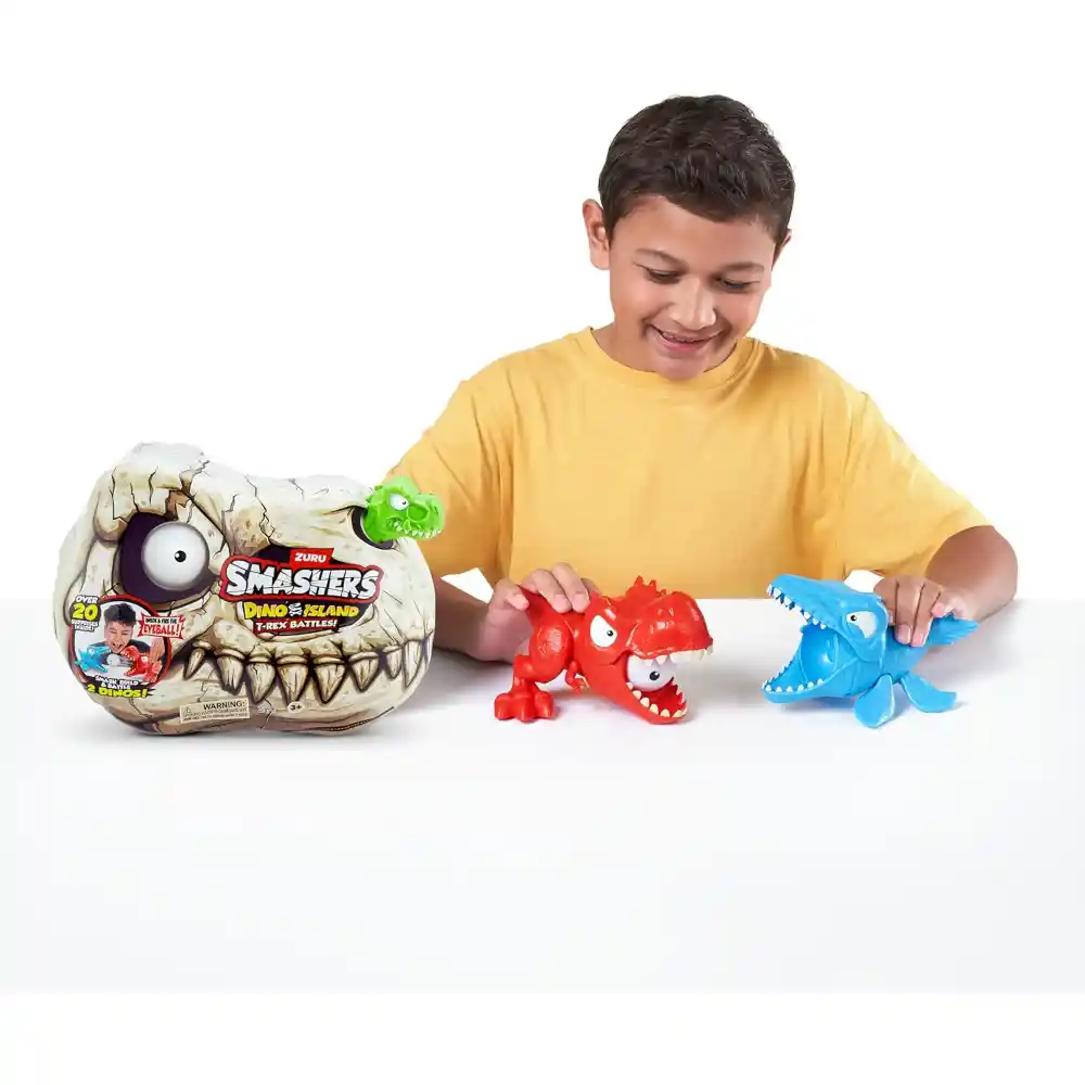 Get ready for the ultimate dino showdown with Smashers Dino Island Mini T-Rex Battles Playset!.Dig through sand and slime to uncover your dinosaur pieces and build 2 battling dinos. Place the light-up eyeball in a dino’s mouth and pull the tail trigger to blast the opponent in smashing action! Smash the mini eggs to reveal collectible characters, then use the egg rebuilder to smash again. With over 20 surprises to dig, build, and battle, dino adventure awaits!